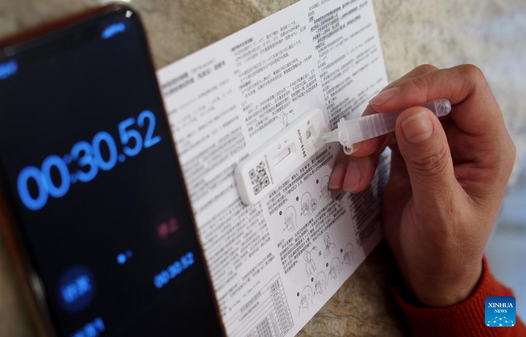 A citizen takes rapid antigen test for COVID-19 in east China's Shanghai, March 26, 2022. Shanghai on Saturday launched a new round of city-wide screening using both nucleic acid and antigen testing amid its latest efforts to contain the COVID-19 outbreak. (Xinhua/Ren Long)