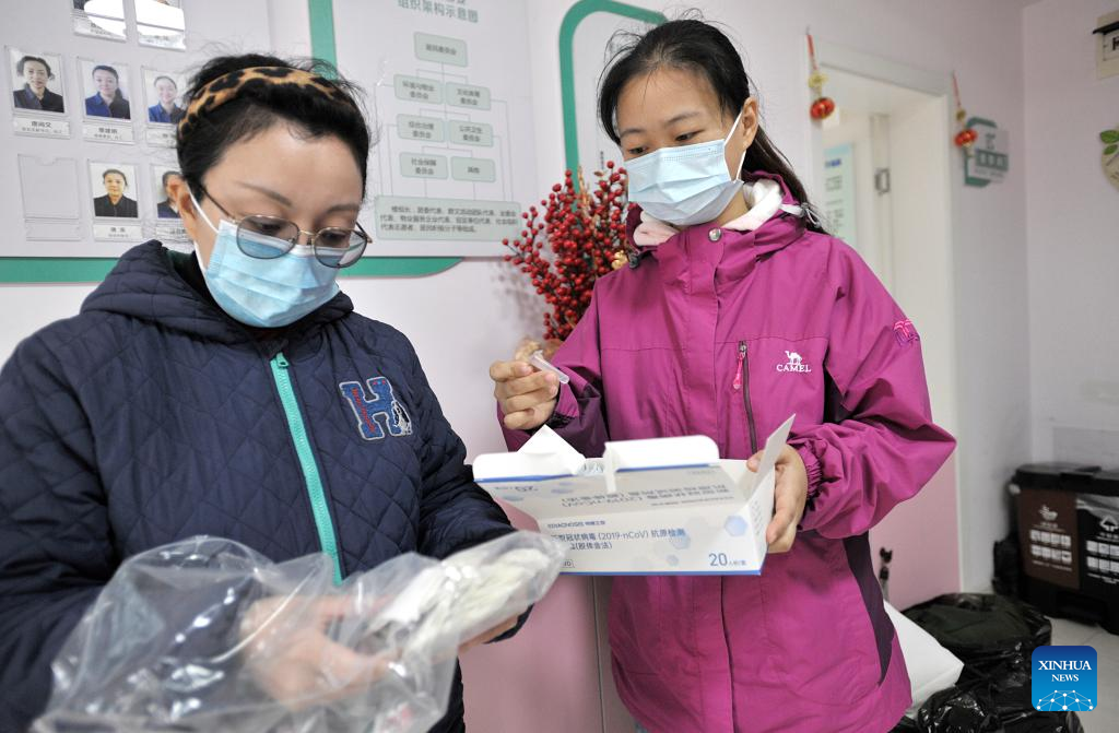 Community workers check rapid antigen test kits in east China's Shanghai, March 26, 2022. Shanghai on Saturday launched a new round of city-wide screening using both nucleic acid and antigen testing amid its latest efforts to contain the COVID-19 outbreak. (Xinhua/Gao Feng)