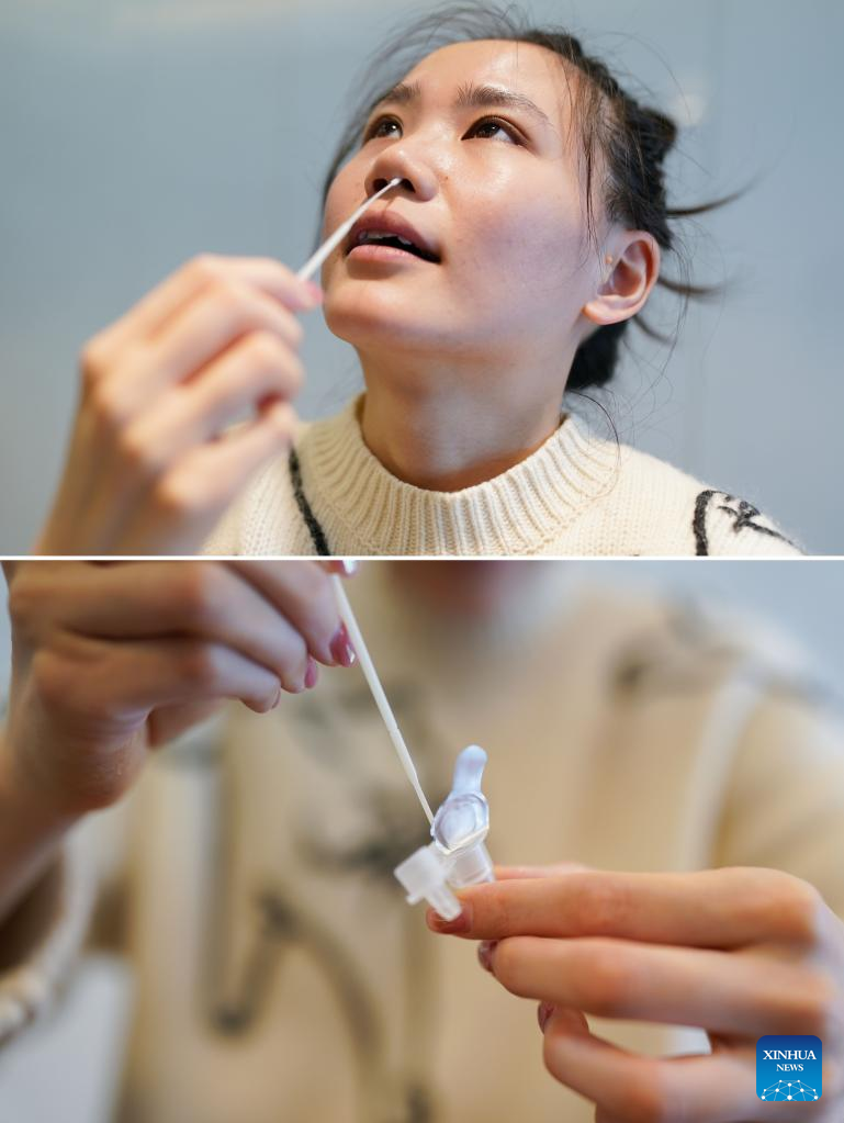 Combo photo taken on March 26, 2022 shows a citizen taking rapid antigen test for COVID-19 in east China's Shanghai. Shanghai on Saturday launched a new round of city-wide screening using both nucleic acid and antigen testing amid its latest efforts to contain the COVID-19 outbreak. (Xinhua/Ding Ting)