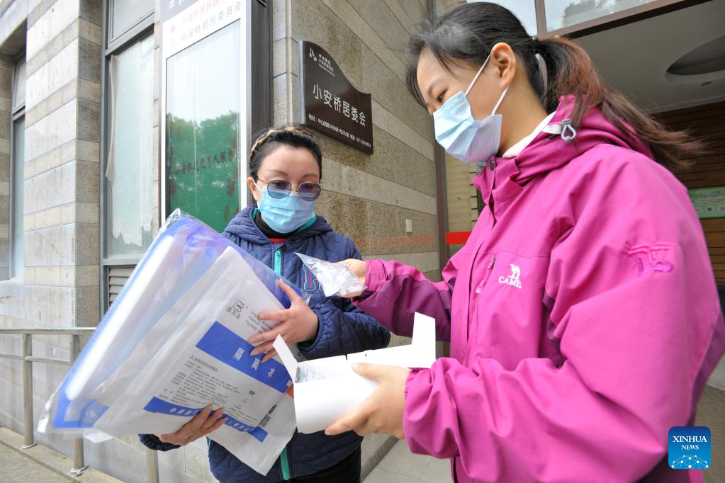 Community workers prepare to distribute rapid antigen test kits in east China's Shanghai, March 26, 2022. Shanghai on Saturday launched a new round of city-wide screening using both nucleic acid and antigen testing amid its latest efforts to contain the COVID-19 outbreak. (Xinhua/Gao Feng)