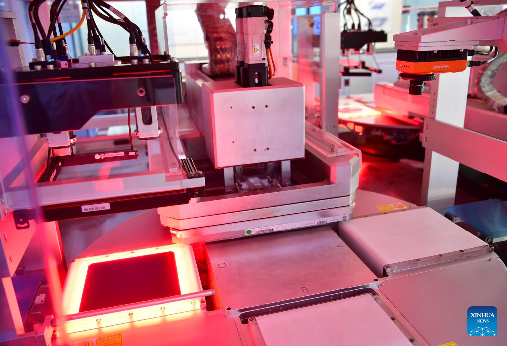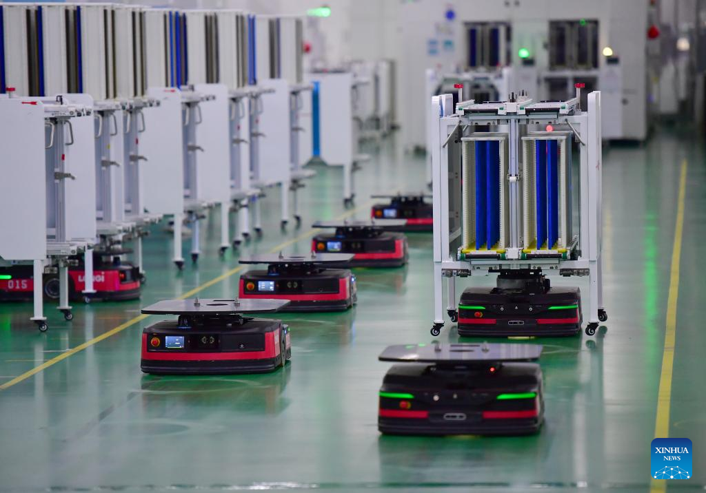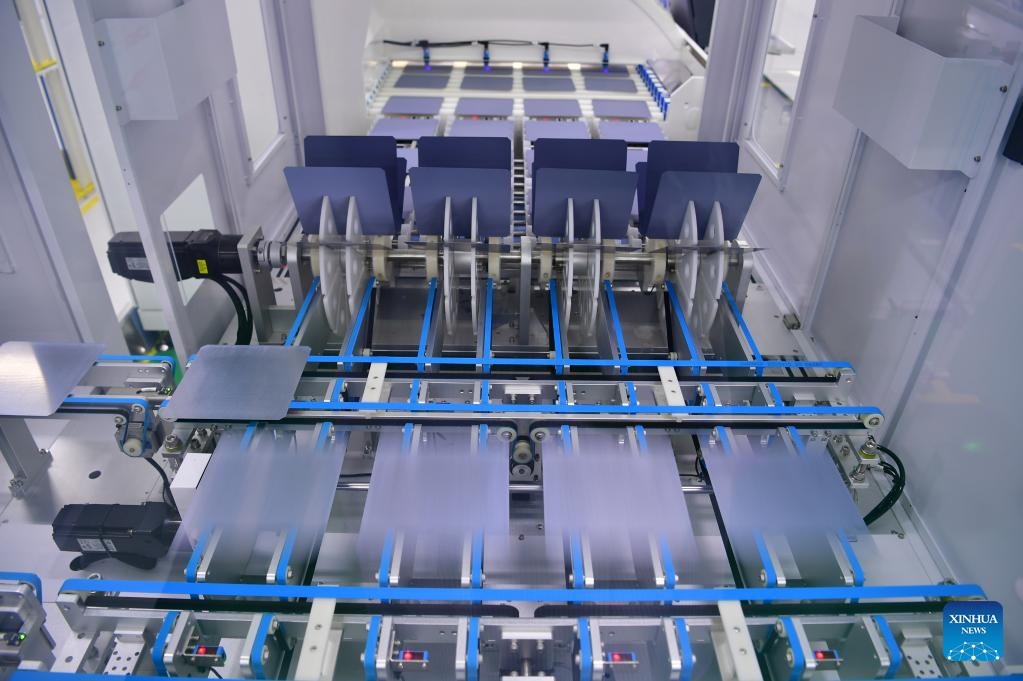Smart robots work at a monocrystalline silicon solar cell factory of LONGi Green Energy Technology Co., Ltd. in Xi'an, northwest China's Shaanxi Province, March 25, 2022. LONGi Green Energy Technology Co., Ltd., a leading PV company in northwest China's Shaanxi Province, has increased its R&D investment to improve intelligent production and material storage while maintaining stable production under strict COVID-19 prevention and control measures.