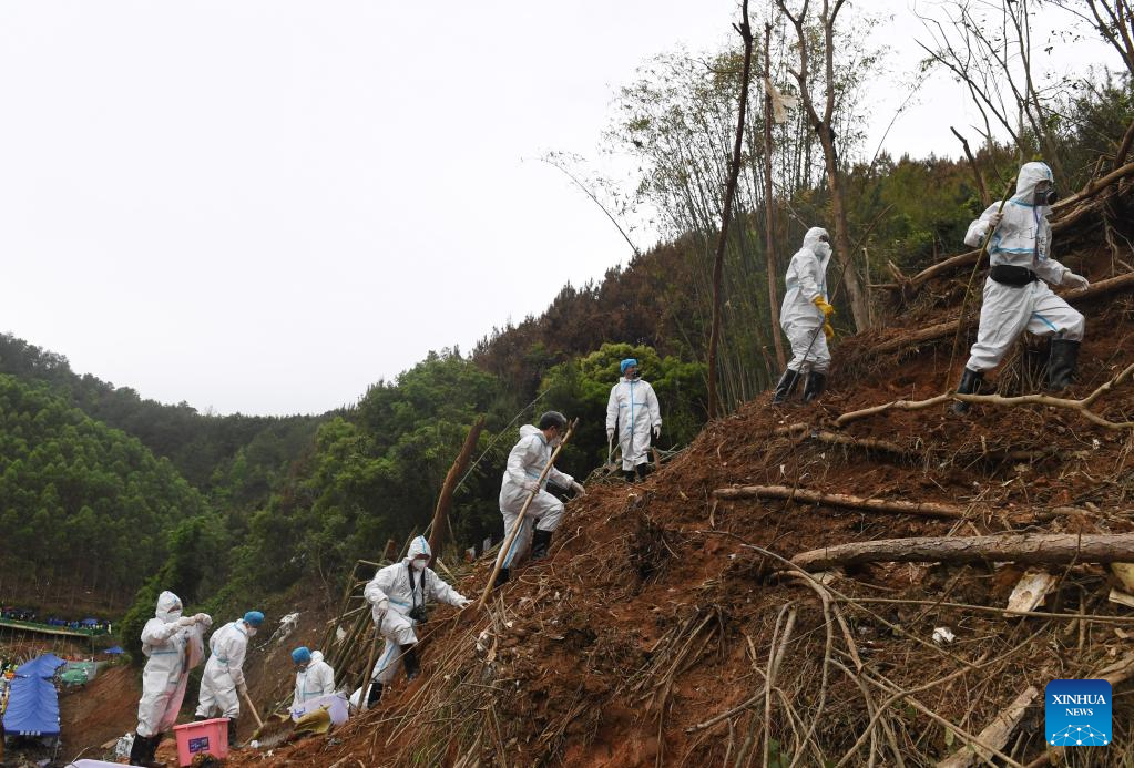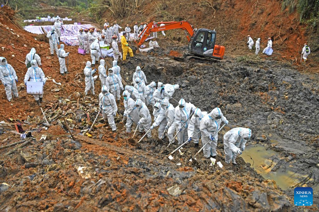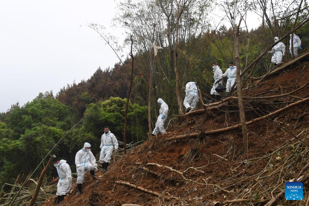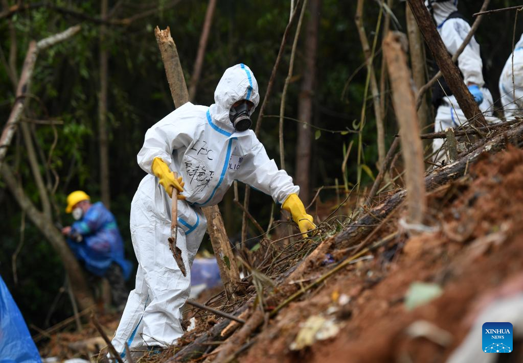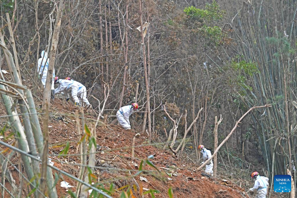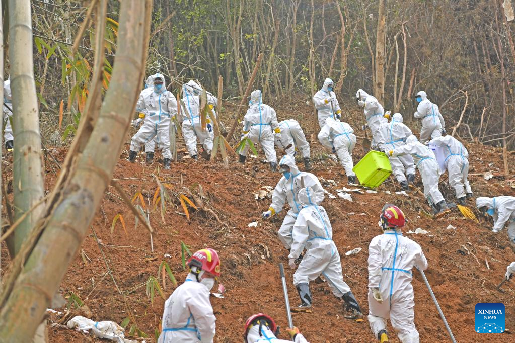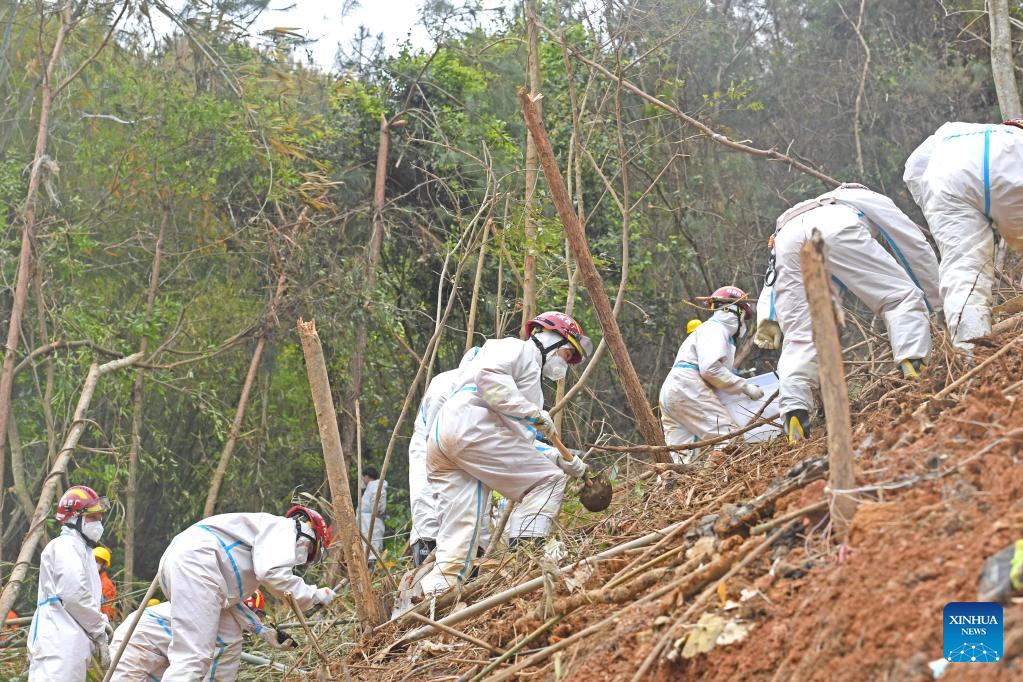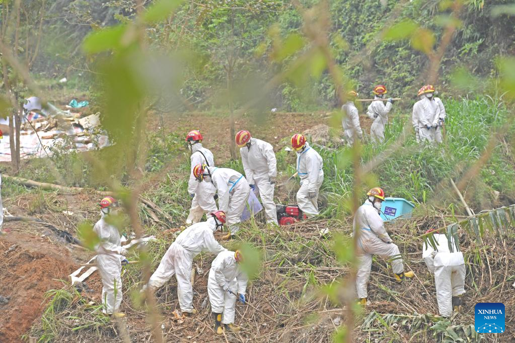 Rescuers conduct search and rescue work at the core site of a recent plane crash in Tengxian County, south China's Guangxi Zhuang Autonomous Region, March 26, 2022. The China Eastern Airlines Boeing 737 aircraft carrying 132 people crashed on the afternoon of March 21 in a mountainous area of Guangxi's Tengxian County. (Xinhua/Zhou Hua)
