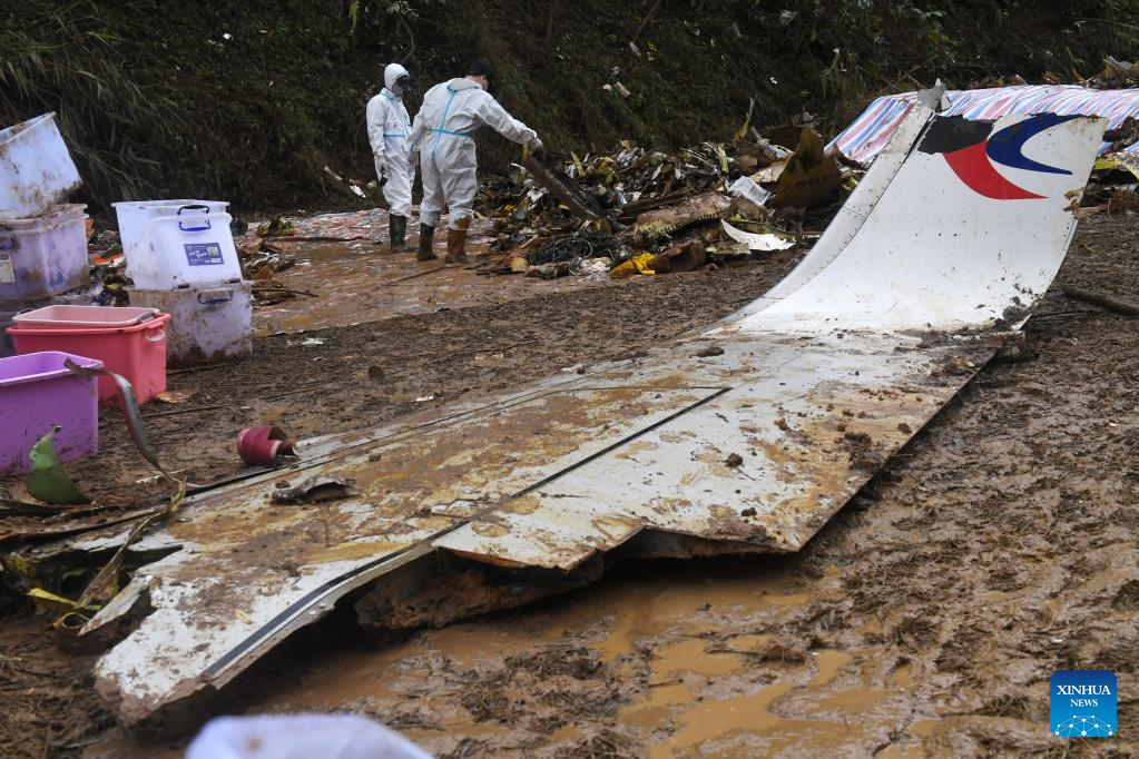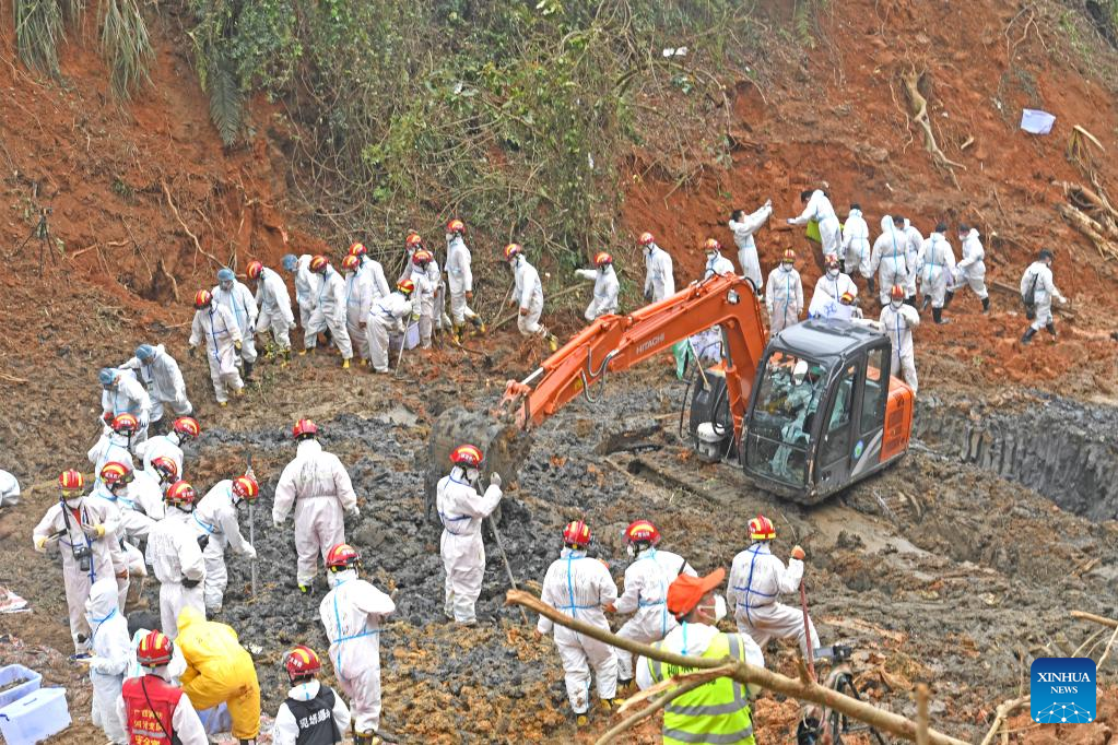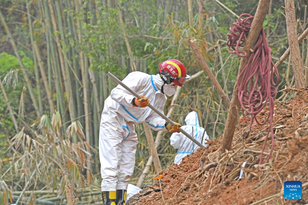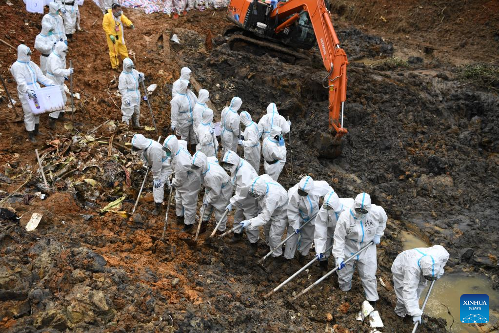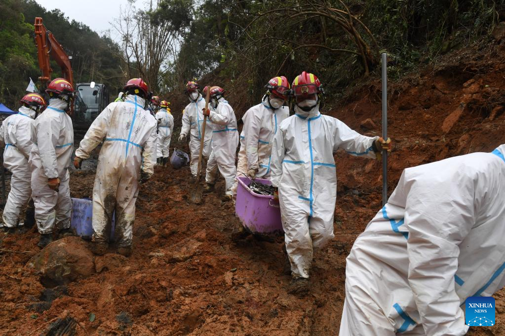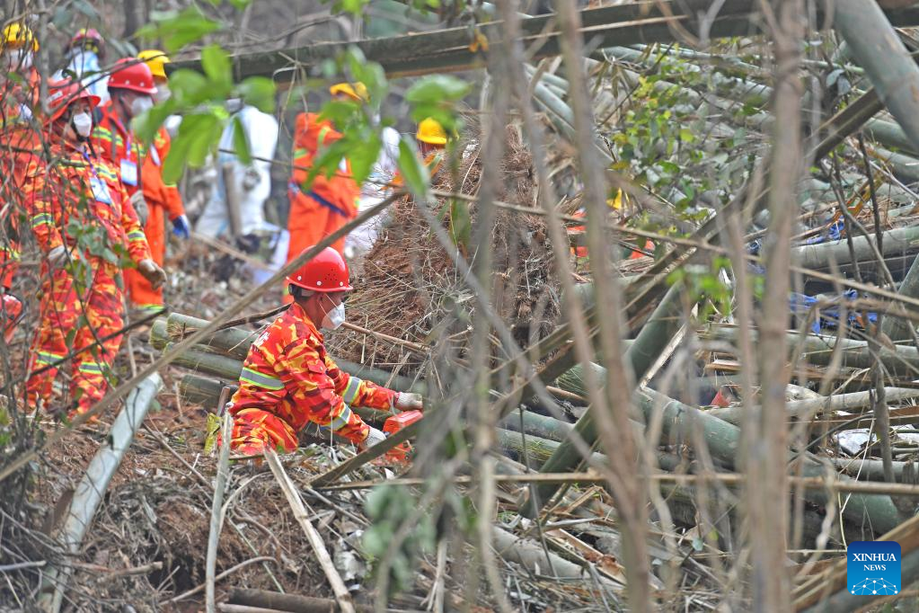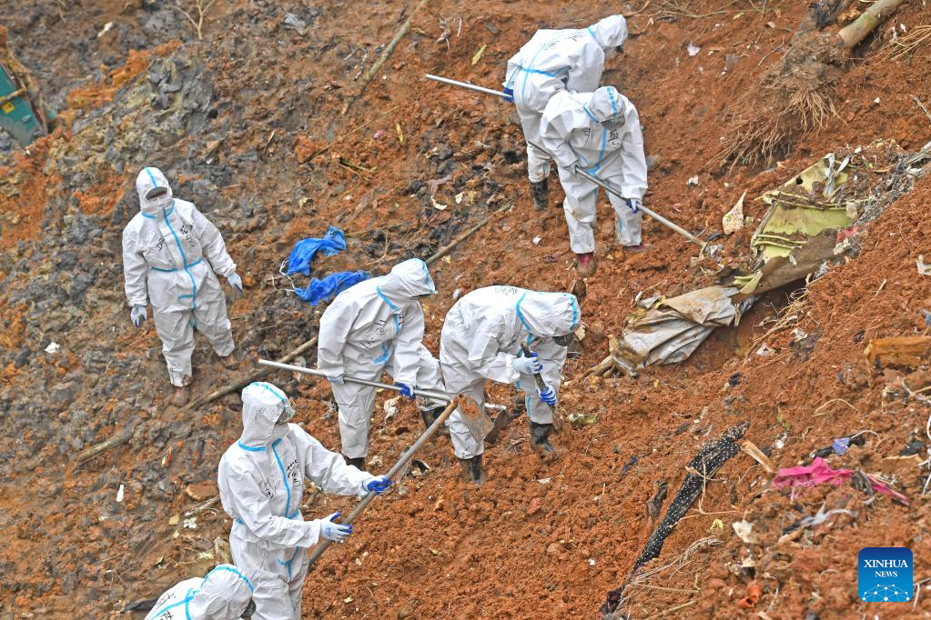 Rescuers conduct search and rescue work at the core site of a recent plane crash in Tengxian County, south China's Guangxi Zhuang Autonomous Region, March 26, 2022. The China Eastern Airlines Boeing 737 aircraft carrying 132 people crashed on the afternoon of March 21 in a mountainous area of Guangxi's Tengxian County. (Xinhua/Zhou Hua)