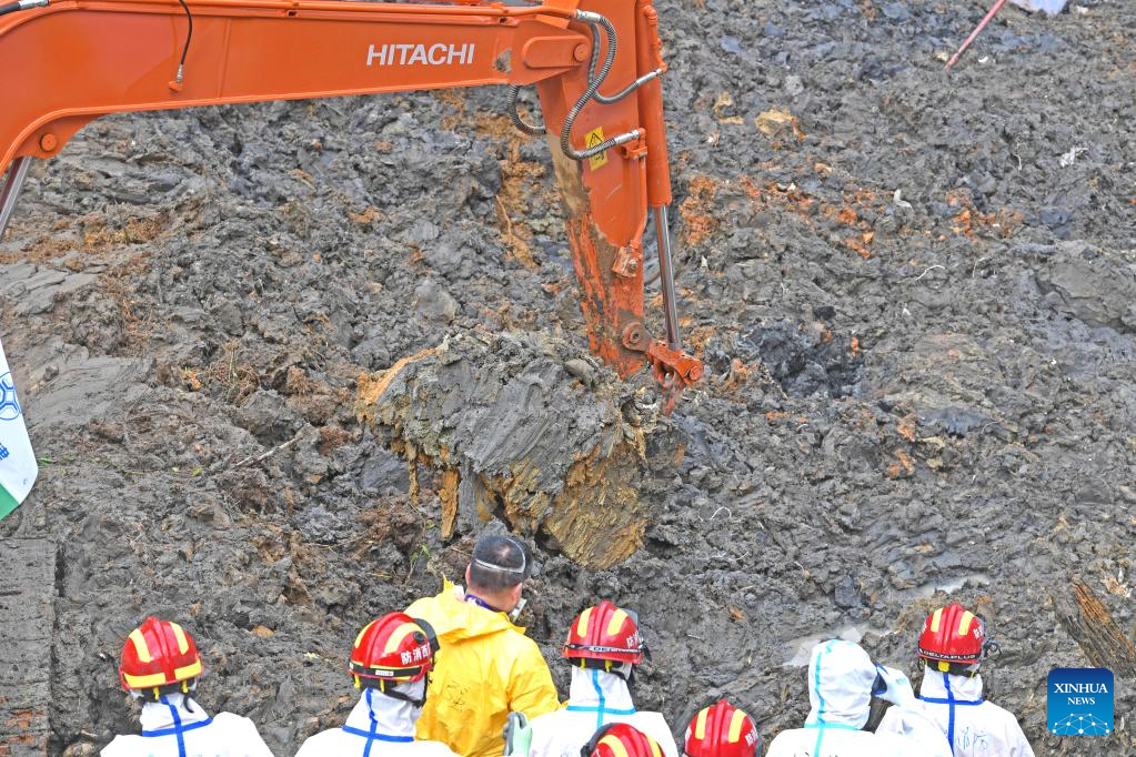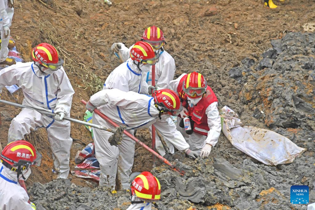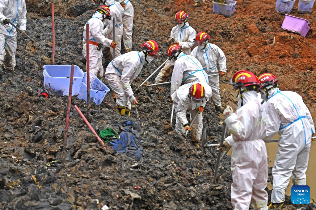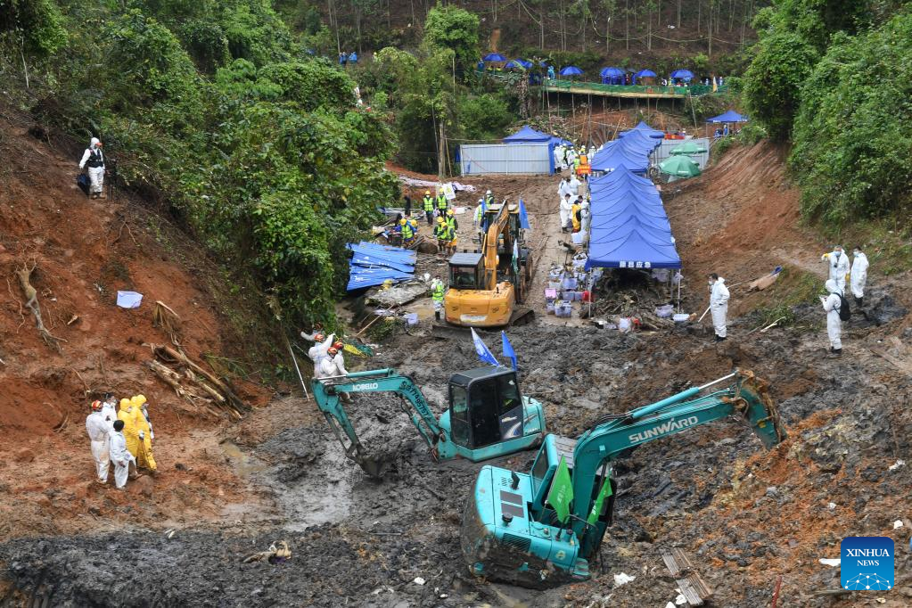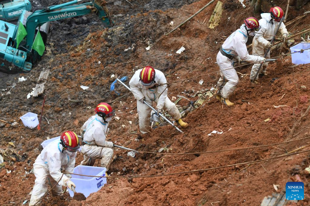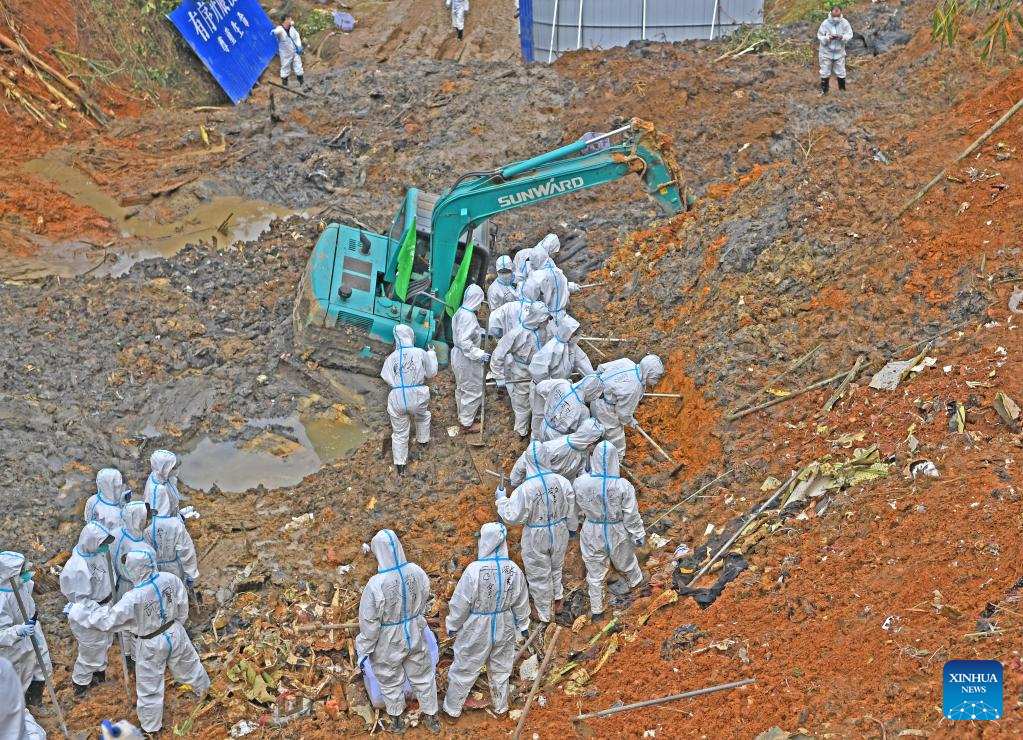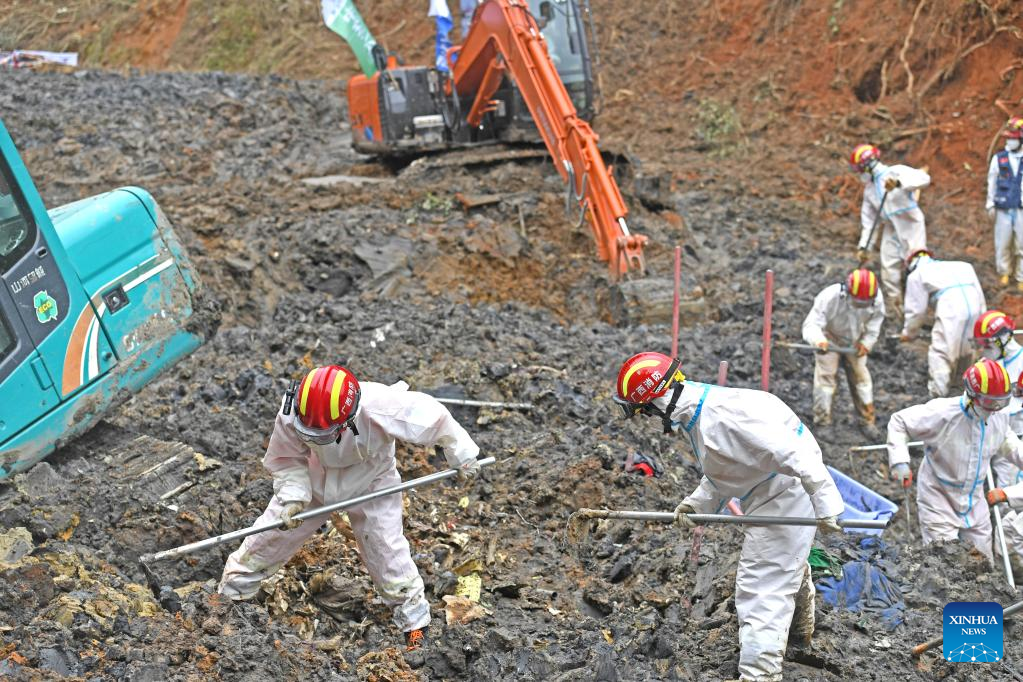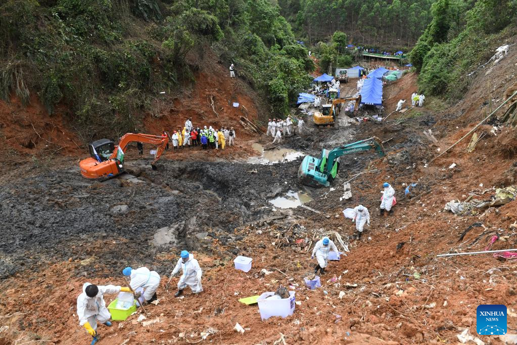 Rescuers conduct search and rescue work at the core site of a recent plane crash in Tengxian County, south China's Guangxi Zhuang Autonomous Region, March 26, 2022. The China Eastern Airlines Boeing 737 aircraft carrying 132 people crashed on the afternoon of March 21 in a mountainous area of Guangxi's Tengxian County. (Xinhua/Zhou Hua)