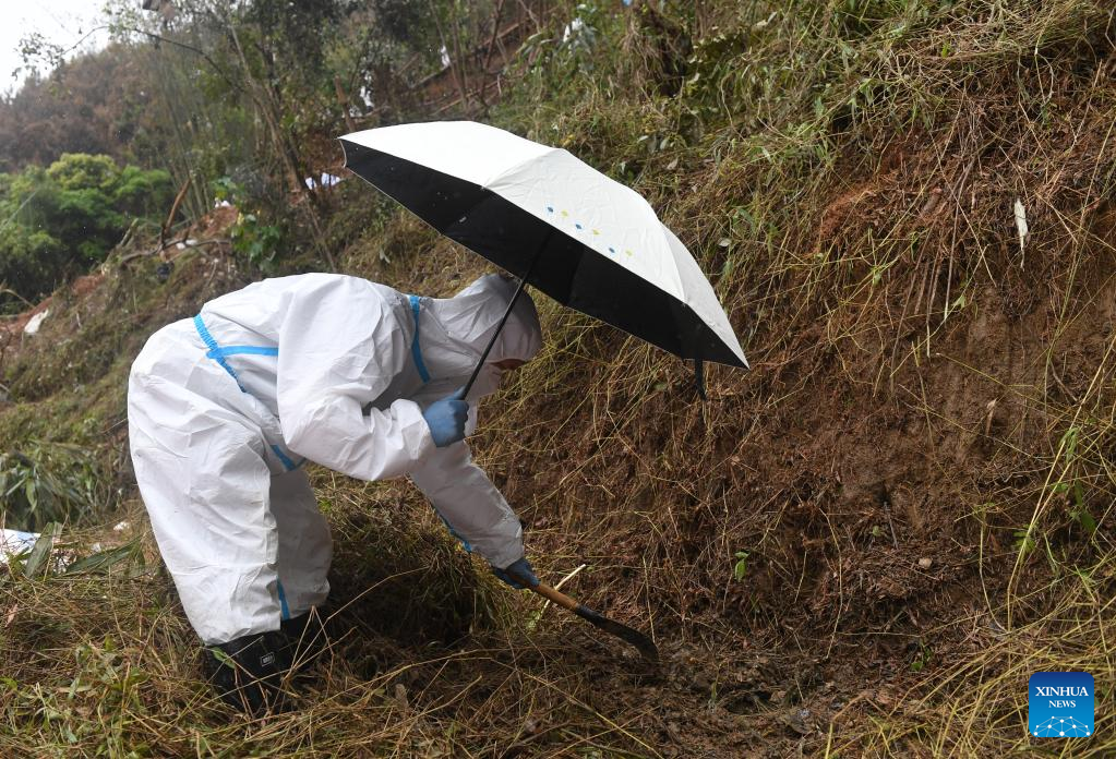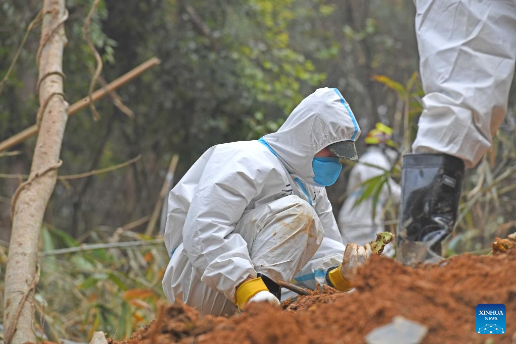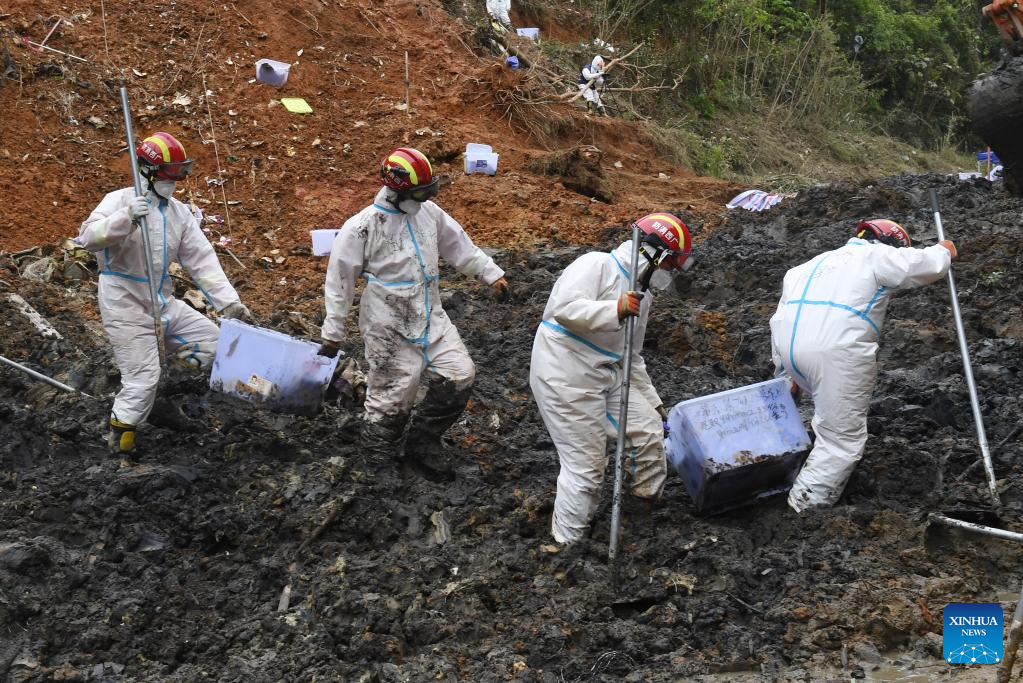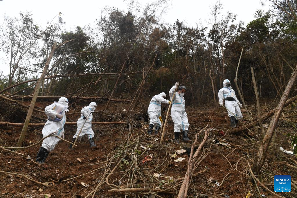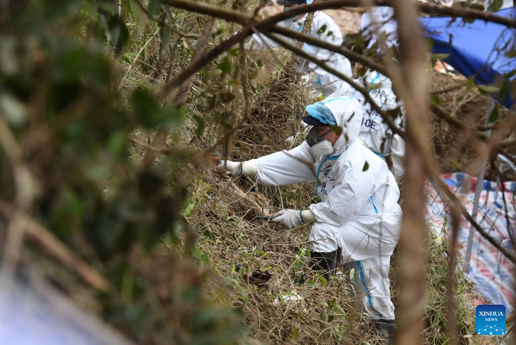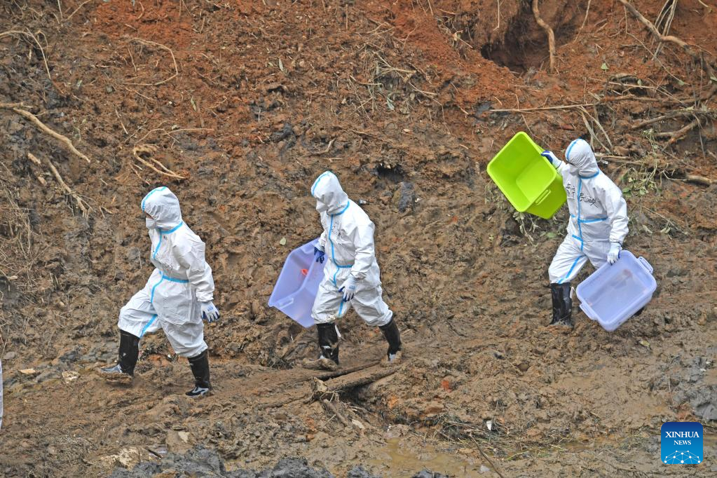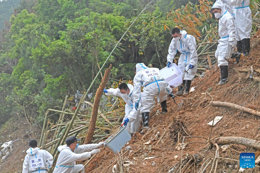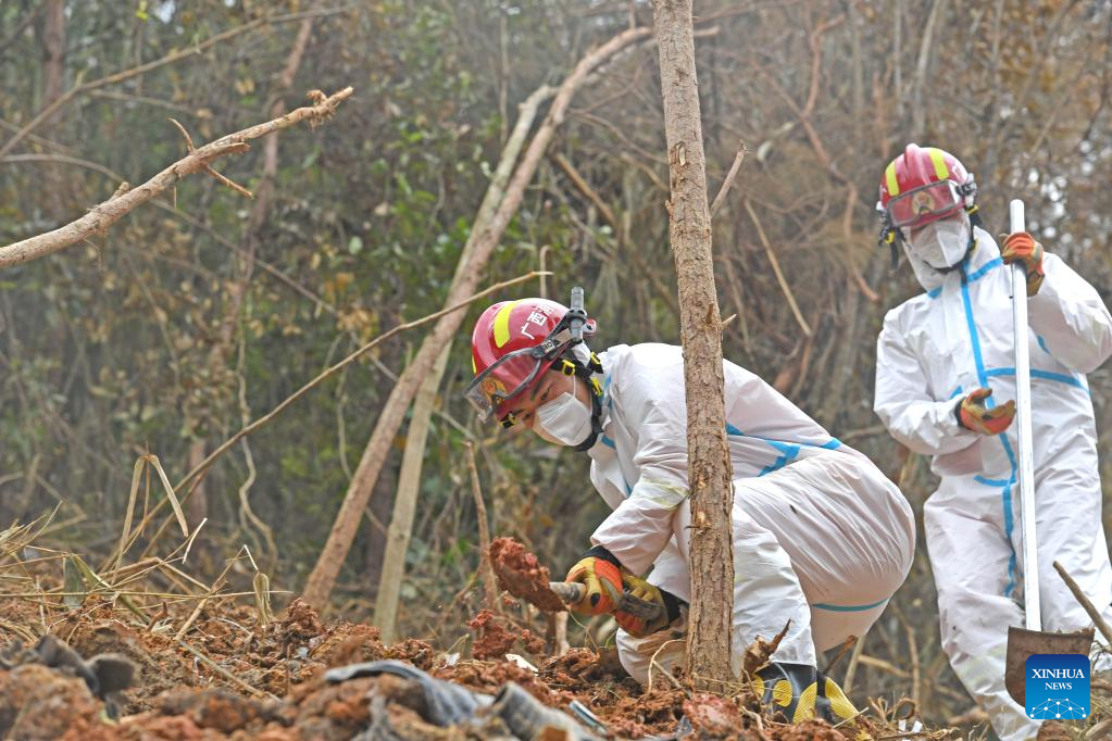 Rescuers check items found at the core site of a recent plane crash in Tengxian County, south China's Guangxi Zhuang Autonomous Region, March 26, 2022. The China Eastern Airlines Boeing 737 aircraft carrying 132 people crashed on the afternoon of March 21 in a mountainous area of Guangxi's Tengxian County. (Xinhua/Zhou Hua)