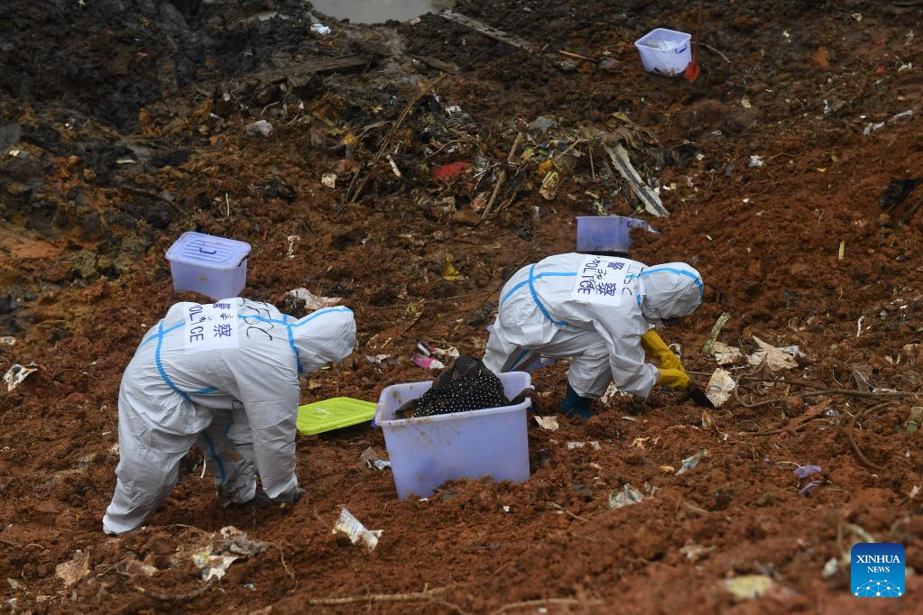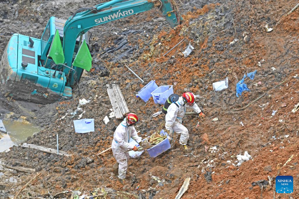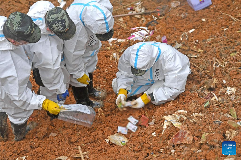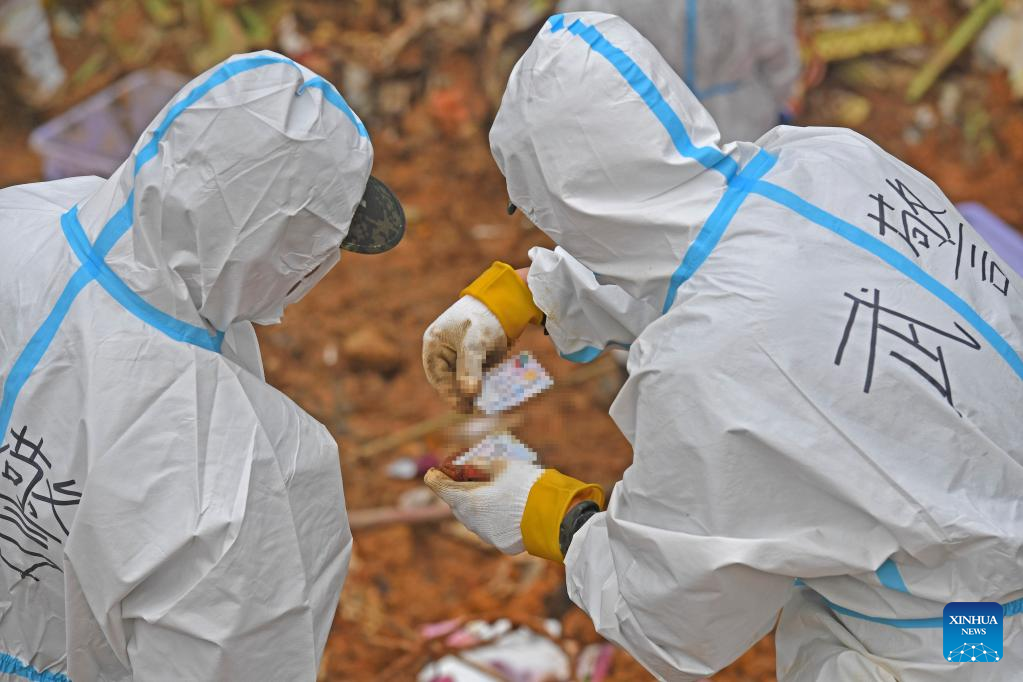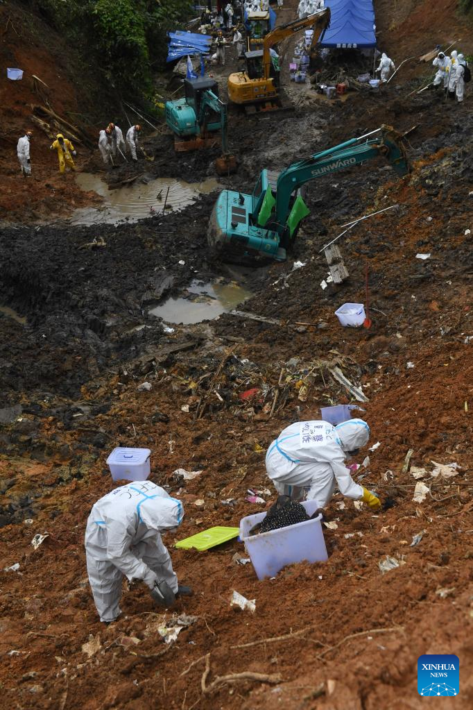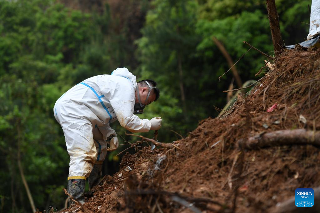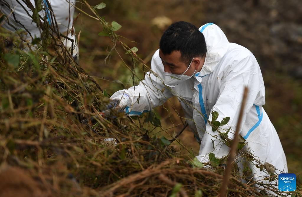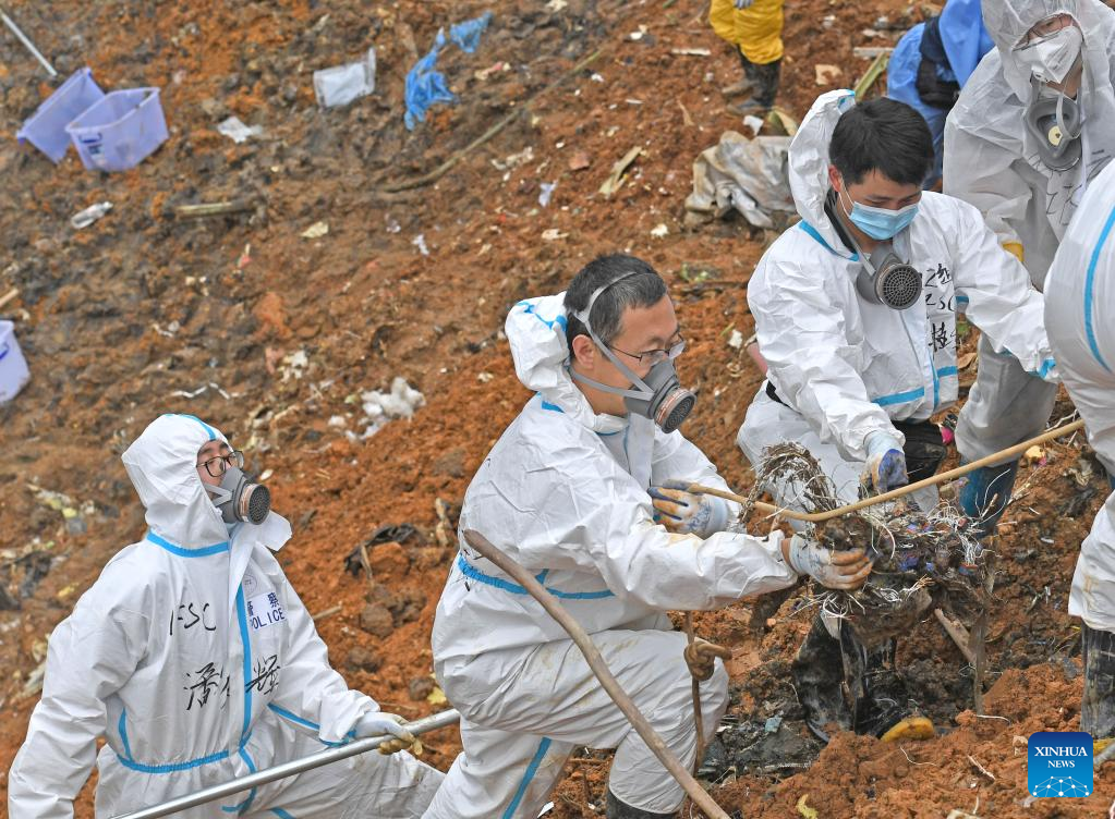Rescuers check items found at the core site of a recent plane crash in Tengxian County, south China's Guangxi Zhuang Autonomous Region, March 26, 2022. The China Eastern Airlines Boeing 737 aircraft carrying 132 people crashed on the afternoon of March 21 in a mountainous area of Guangxi's Tengxian County. (Xinhua/Zhou Hua)