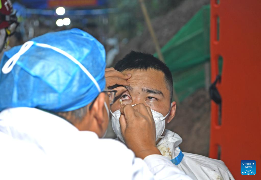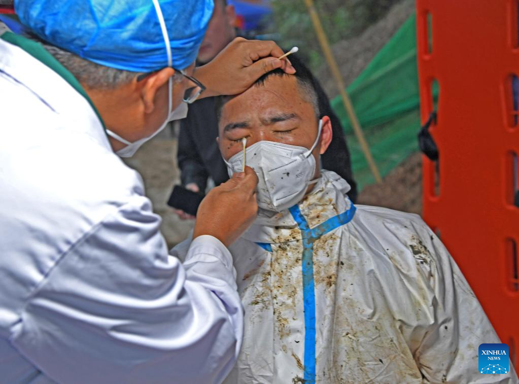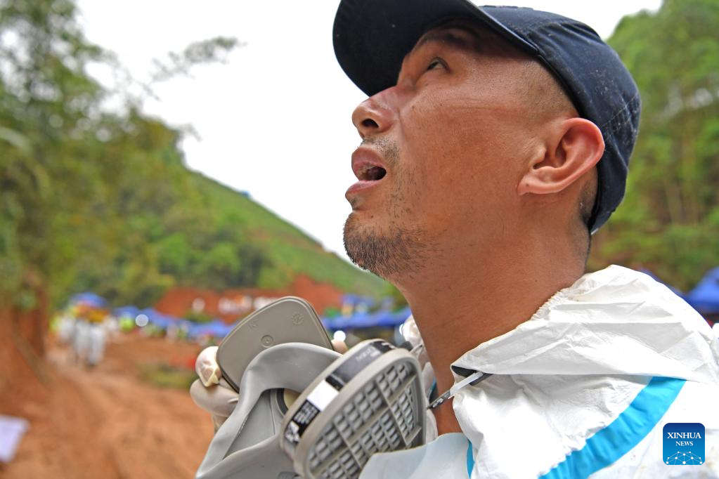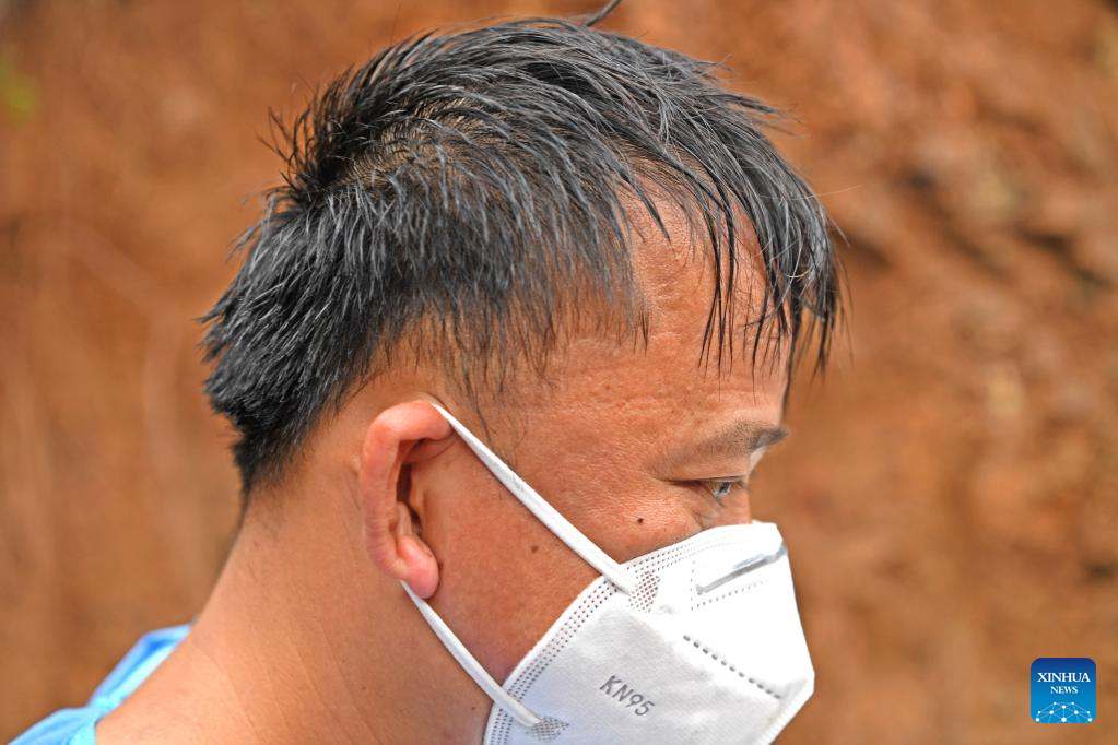 A rescuer receives on-site medical treatment at the core site of a recent plane crash in Tengxian County, south China's Guangxi Zhuang Autonomous Region, March 26, 2022. The China Eastern Airlines Boeing 737 aircraft carrying 132 people crashed on the afternoon of March 21 in a mountainous area of Guangxi's Tengxian County. (Xinhua/Zhou Hua)