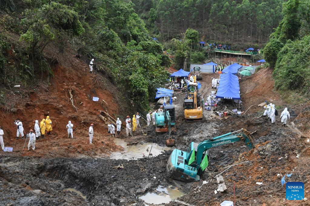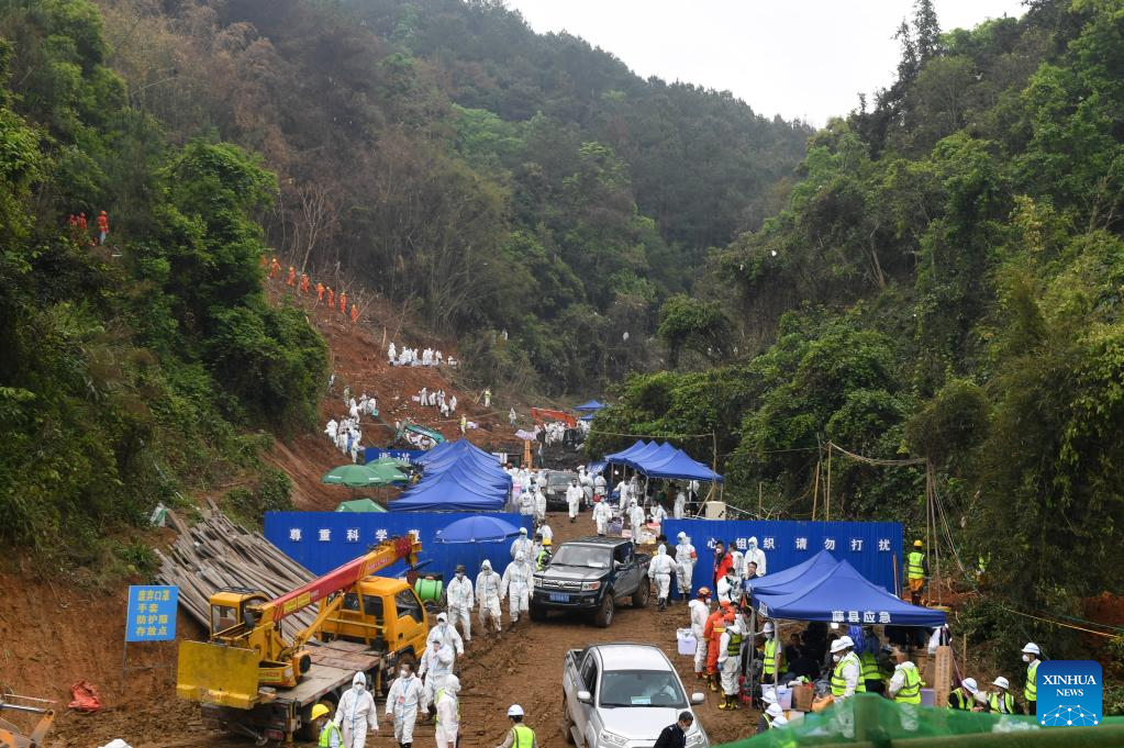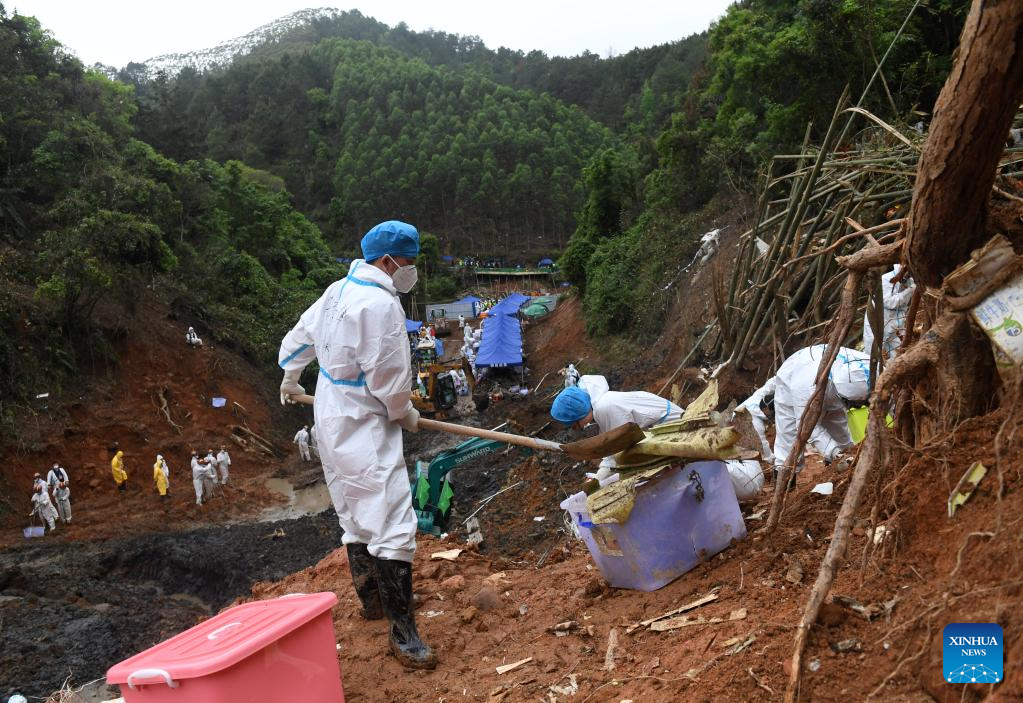 Rescuers conduct search and rescue work at the core site of a recent plane crash in Tengxian County, south China's Guangxi Zhuang Autonomous Region, March 26, 2022. The China Eastern Airlines Boeing 737 aircraft carrying 132 people crashed on the afternoon of March 21 in a mountainous area of Guangxi's Tengxian County. (Xinhua/Lu Boan)