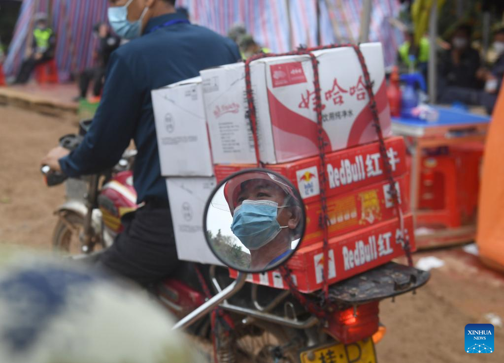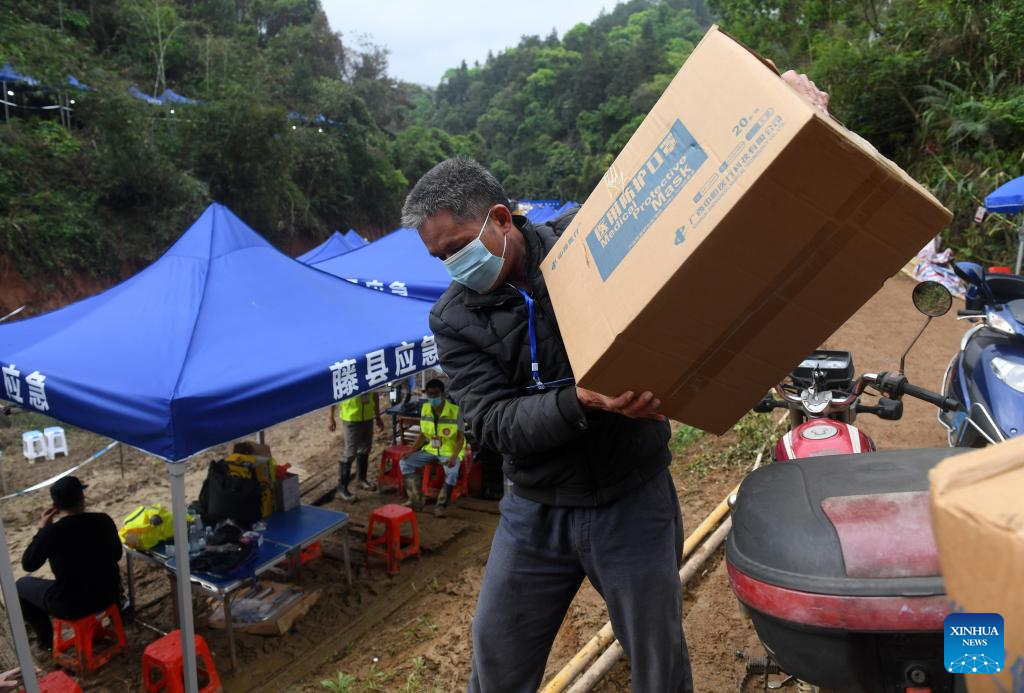 A volunteer rider unloads relief supplies at the site of a recent plane crash in Tengxian County, south China's Guangxi Zhuang Autonomous Region, March 26, 2022.(Xinhua/Lu Boan)