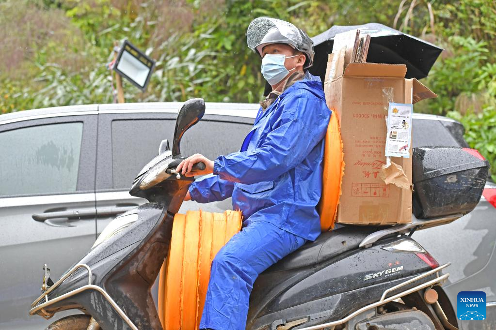 A volunteer rider helps carry relief supplies to the site of a recent plane crash in Tengxian County, south China's Guangxi Zhuang Autonomous Region, March 26, 2022. (Xinhua/Lu Boan)