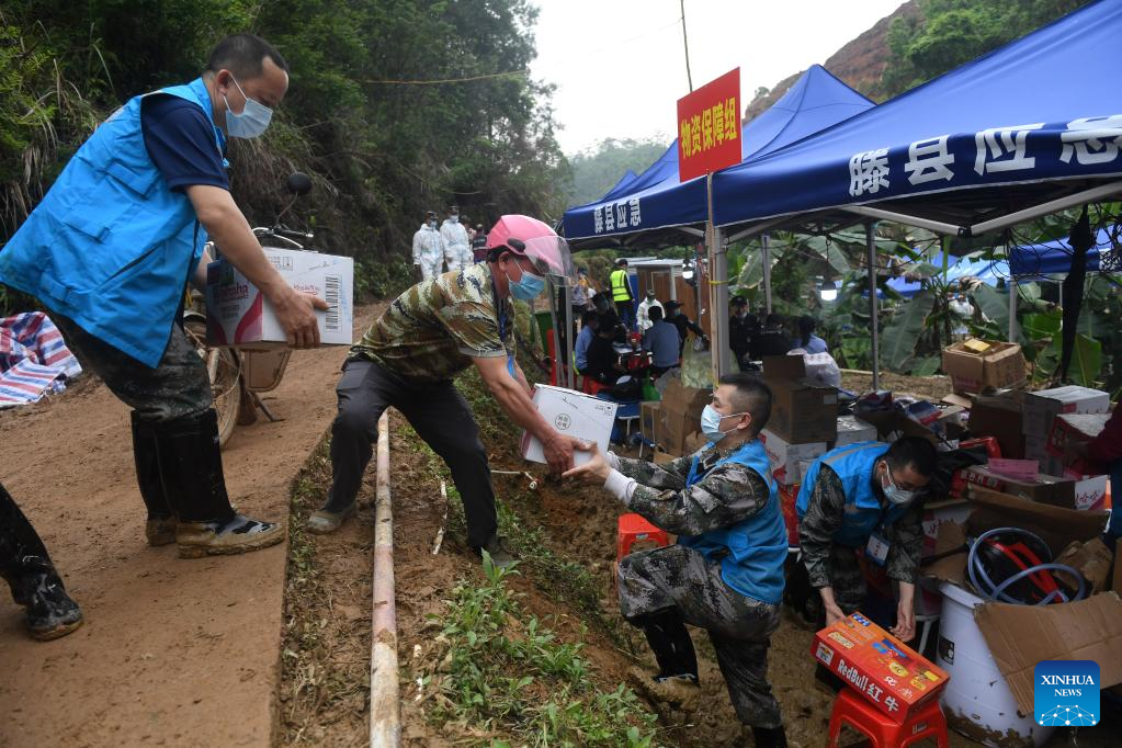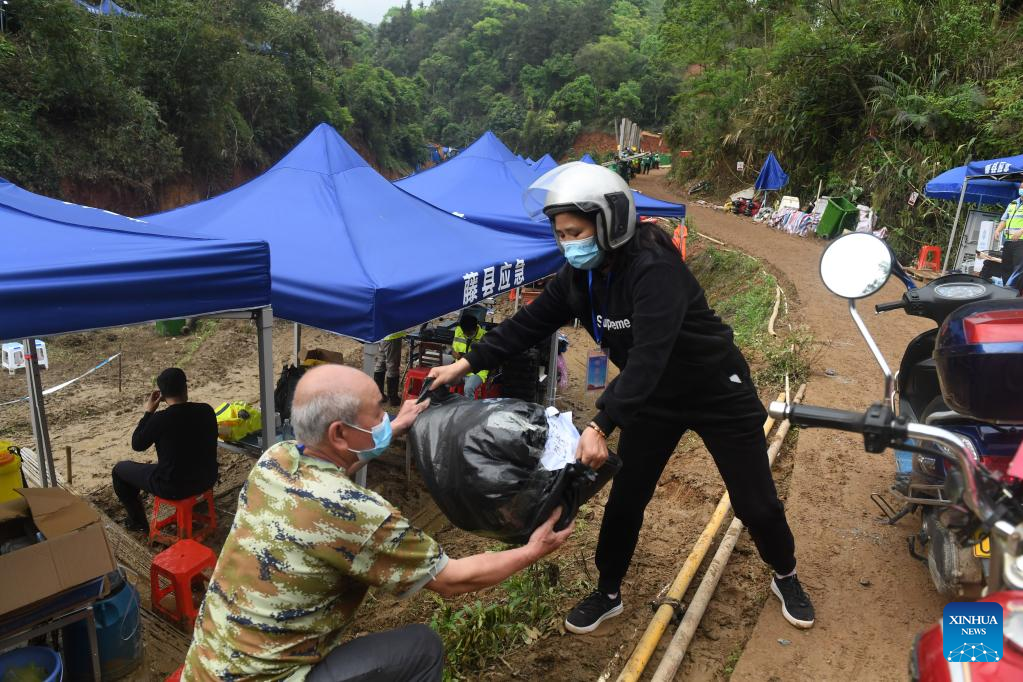 A volunteer rider (2nd L) unloads relief supplies at the site of a recent plane crash in Tengxian County, south China's Guangxi Zhuang Autonomous Region, March 26, 2022.(Xinhua/Lu Boan)