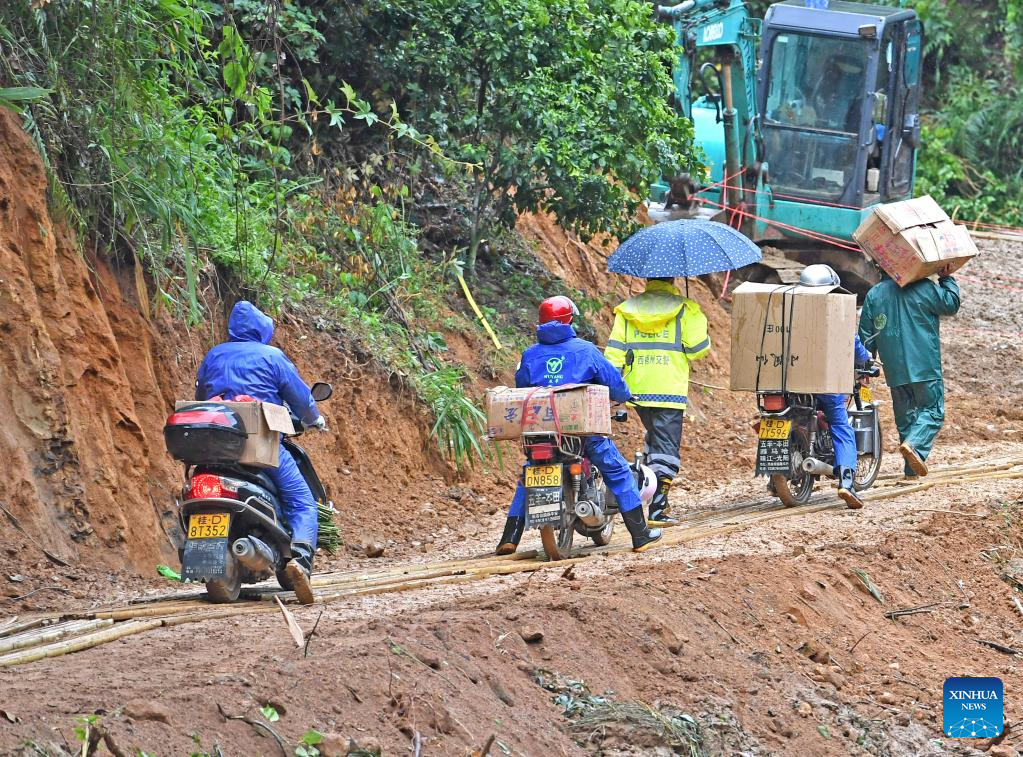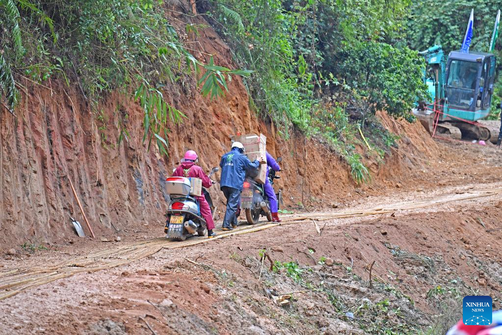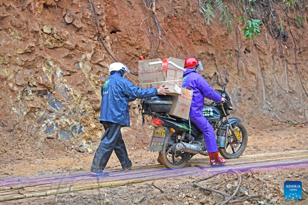 Volunteer riders help carry relief supplies to the site of a recent plane crash in Tengxian County, south China's Guangxi Zhuang Autonomous Region, March 26, 2022.(Xinhua/Lu Boan)