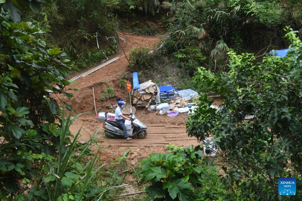 A volunteer rider helps carry relief supplies to the site of a recent plane crash in Tengxian County, south China's Guangxi Zhuang Autonomous Region, March 26, 2022.(Xinhua/Lu Boan)