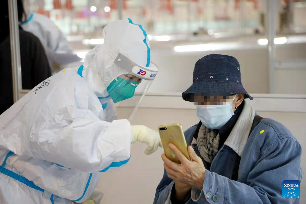 A staff member helps a patient to register at a designated quarantine facility in east China's Shanghai, March 26, 2022. Local authorities have renovated seven venues, including hospitals and stadiums, to quarantine mild cases and asymptomatic carriers. (Photo by Ye Jiaqi/Xinhua)