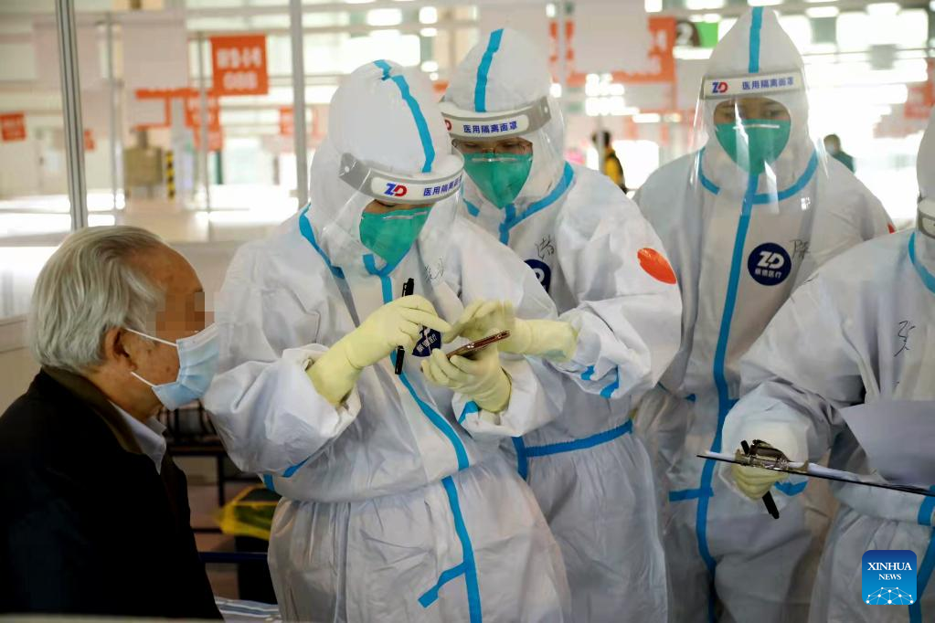 Staff members help a patient to register at a designated quarantine facility in east China's Shanghai, March 26, 2022. Local authorities have renovated seven venues, including hospitals and stadiums, to quarantine mild cases and asymptomatic carriers. (Photo by Ye Jiaqi/Xinhua)