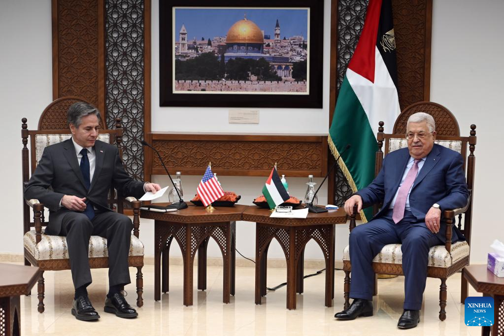 RAMALLAH, March 27 (Xinhua) -- Palestinian President Mahmoud Abbas on Sunday told visiting U.S. Secretary of State Antony Blinken that the Israeli occupation of the Palestinian territories must end through a political solution.