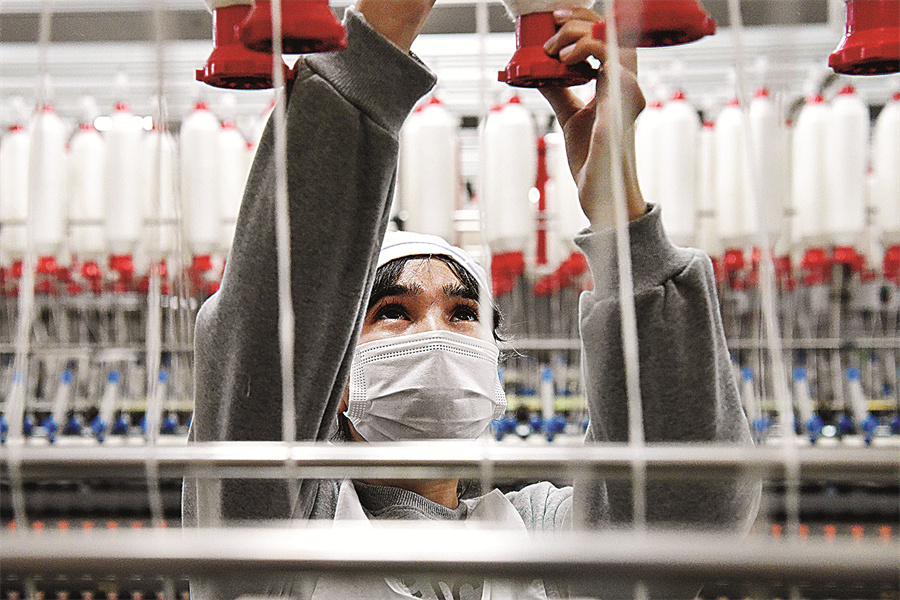 A woman works at a textile factory in an industrial park in Moyu county, in January. [DING LEI/XINHUA]