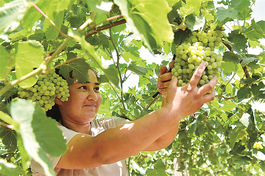 A farmer picks bunches of grapes in Shanshan county during the spring harvest. [DING LEI/XINHUA]