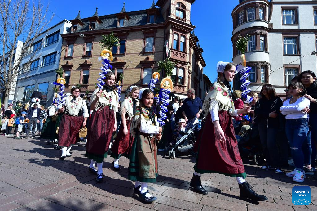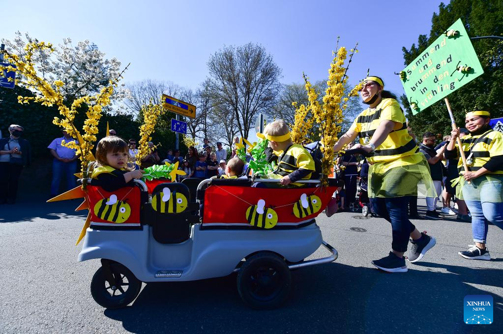 Children take part in the Summer Day Parade in Weinheim, Germany, on March 27, 2022. (Xinhua/Lu Yang)
