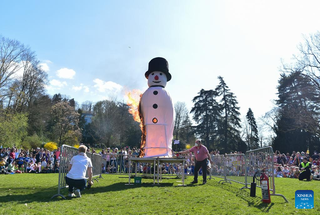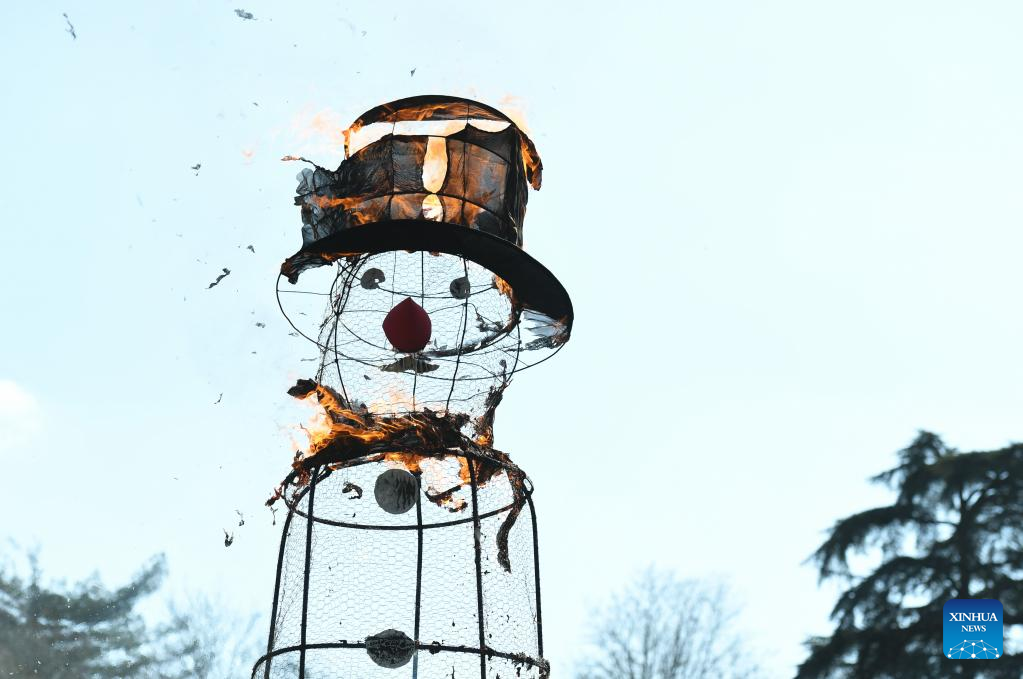 A "snowman" is burnt after the Summer Day Parade in Weinheim, Germany, on March 27, 2022. (Xinhua/Lu Yang)
