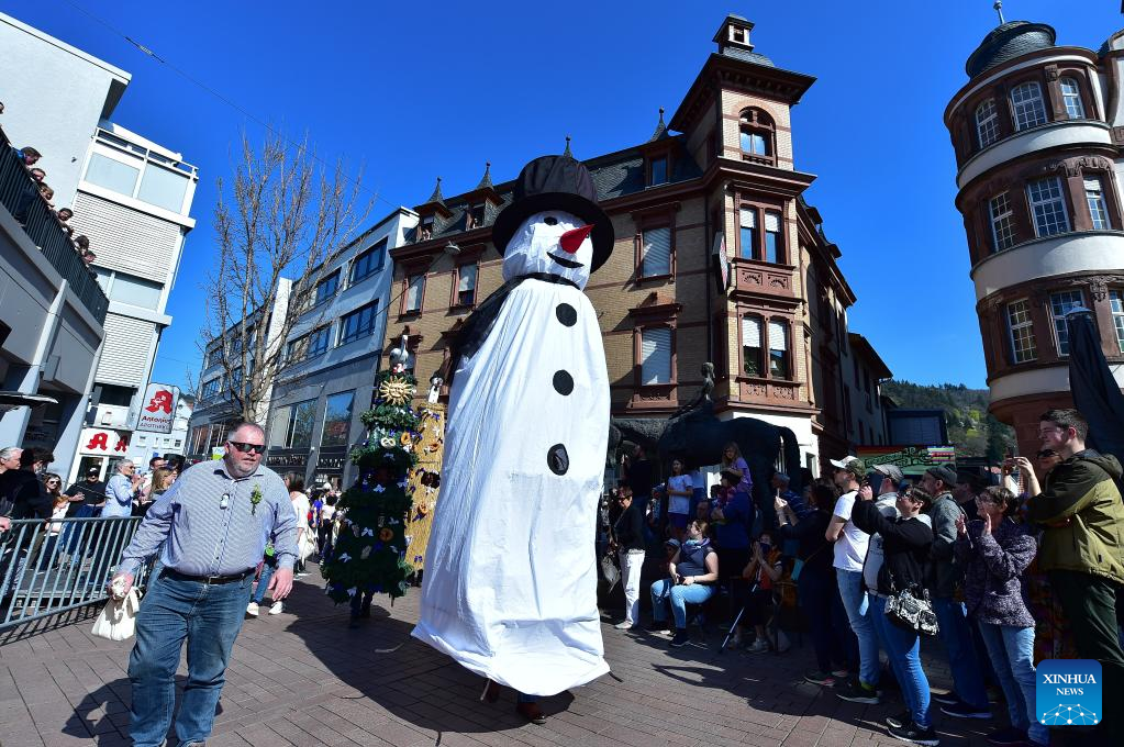 A "snowman" is seen during the Summer Day Parade in Weinheim, Germany, on March 27, 2022. (Xinhua/Lu Yang)