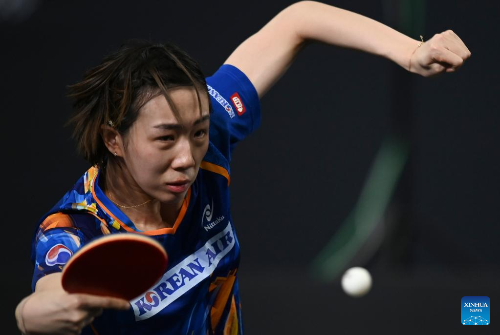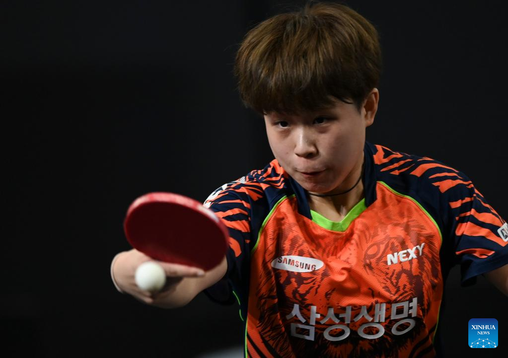 Joo Cheonhui of South Korea hits a return during the women's singles round of 64 match between Soo Wai Yam Minnie of China's Hong Kong and Joo Cheonhui of South Korea at the WTT Star Contender Doha 2022 in Doha, Qatar, March 27, 2022. (Photo by Nikku/Xinhua)