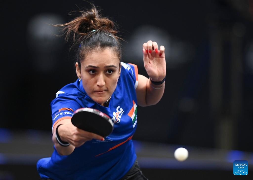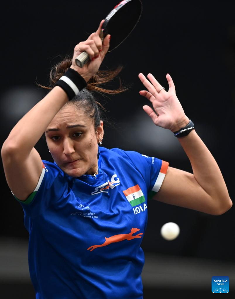 Manika Batra of India hits a return during the women's singles round of 64 match between Qian Tianyi of China and Manika Batra of India at the WTT Star Contender Doha 2022 in Doha, Qatar, March 27, 2022. (Photo by Nikku/Xinhua)