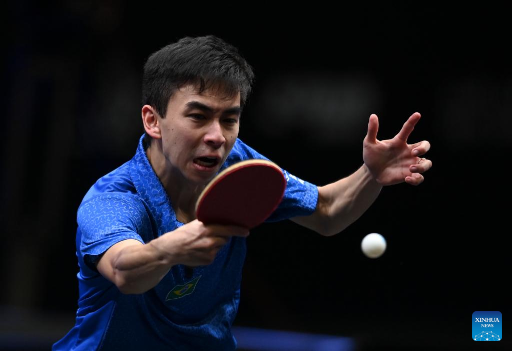 Vitor Ishiy of Brazil hits a return during the men's singles round of 64 match between Xue Fei of China and Vitor Ishiy of Brazil at the WTT Star Contender Doha 2022 in Doha, Qatar, March 27, 2022. (Photo by Nikku/Xinhua)