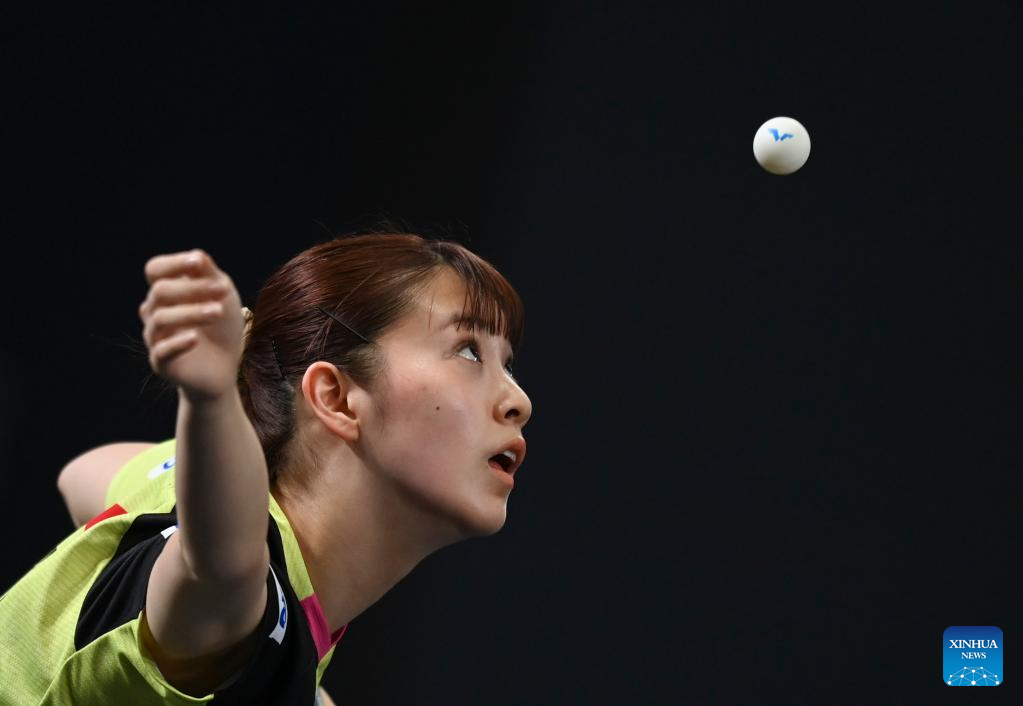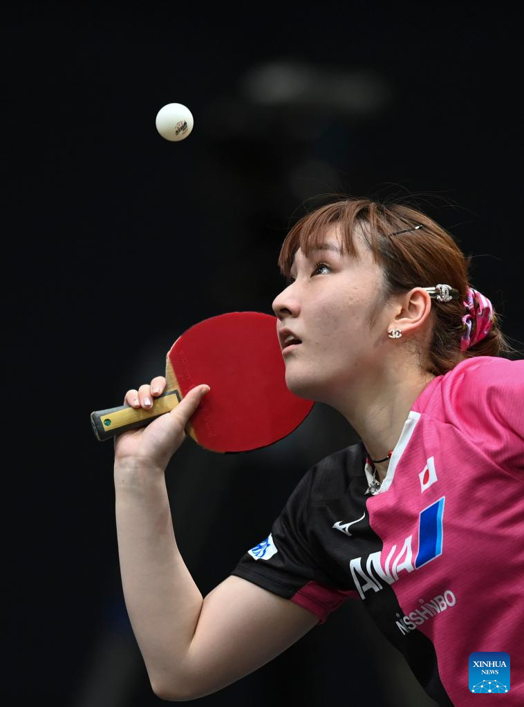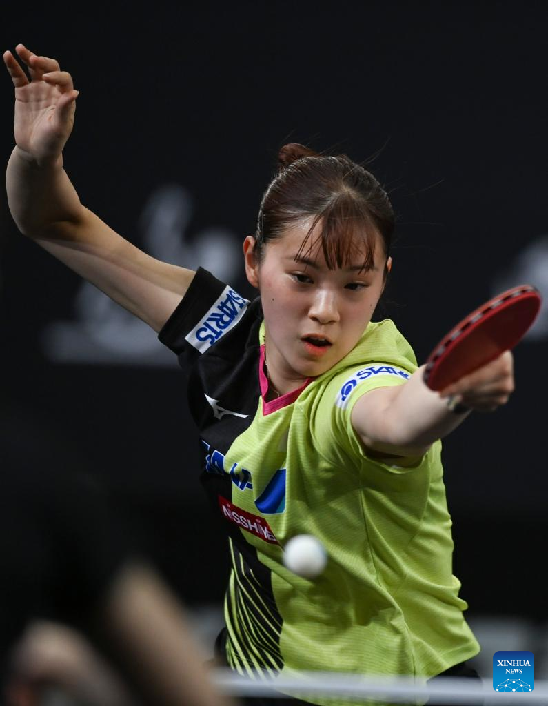 Nagasaki Miyu of Japan hits a return during the women's singles round of 48 match between Liu Weishan of China and Nagasaki Miyu of Japan at the WTT Star Contender Doha 2022 in Doha, Qatar, March 27, 2022. (Photo by Nikku/Xinhua)