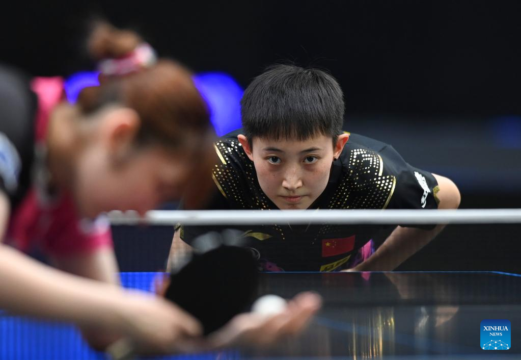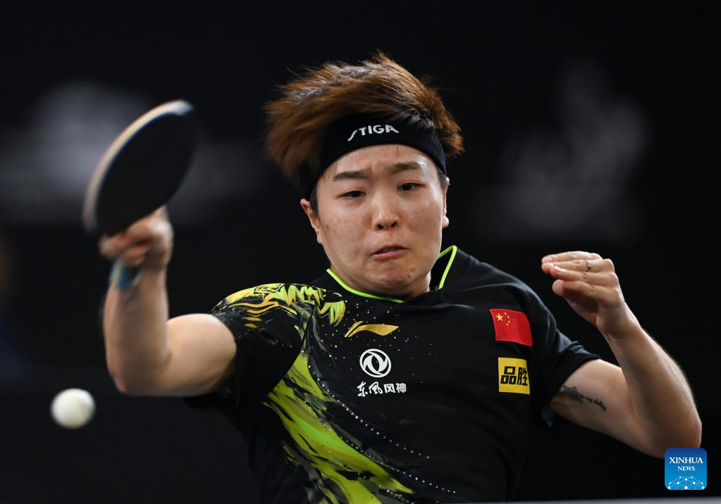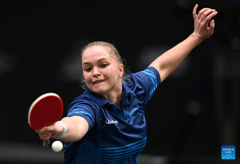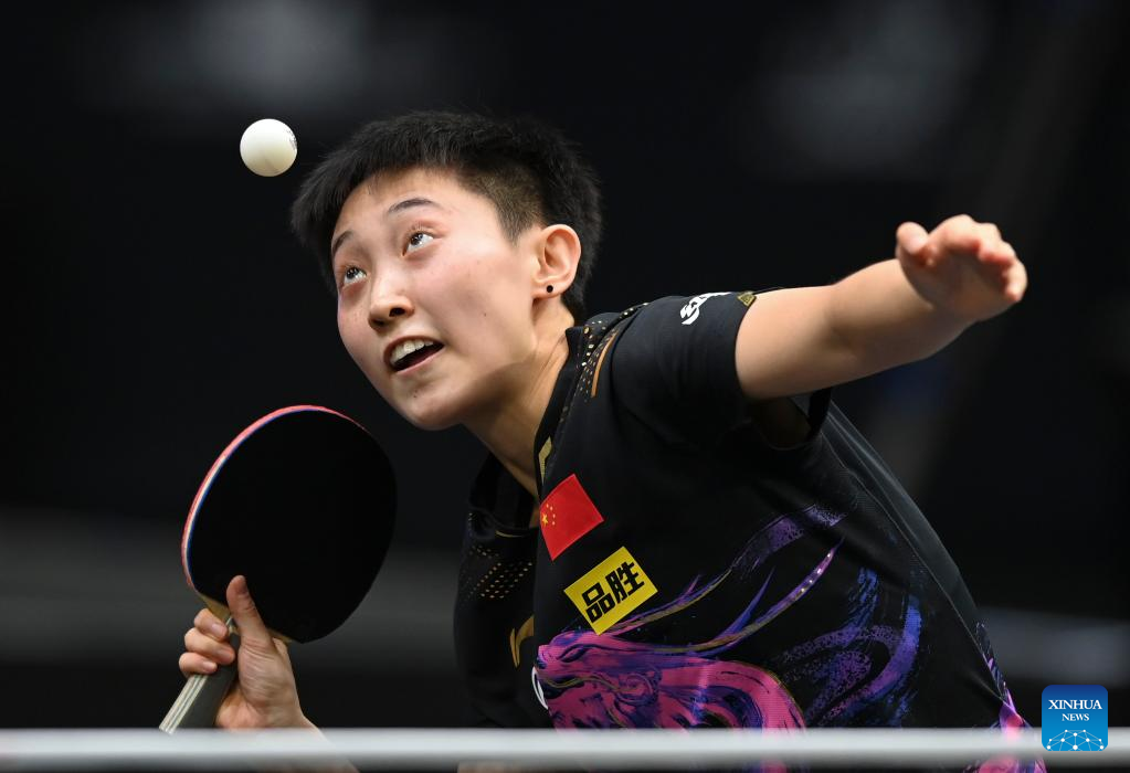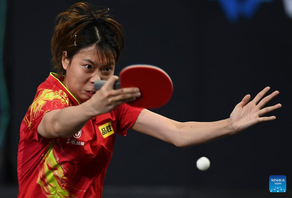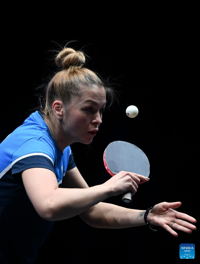 Qi Fei of China hits a return during the women's singles round of 48 match between Qi Fei of China and Sabine Winter of Germany at the WTT Star Contender Doha 2022 in Doha, Qatar, March 27, 2022. (Photo by Nikku/Xinhua)