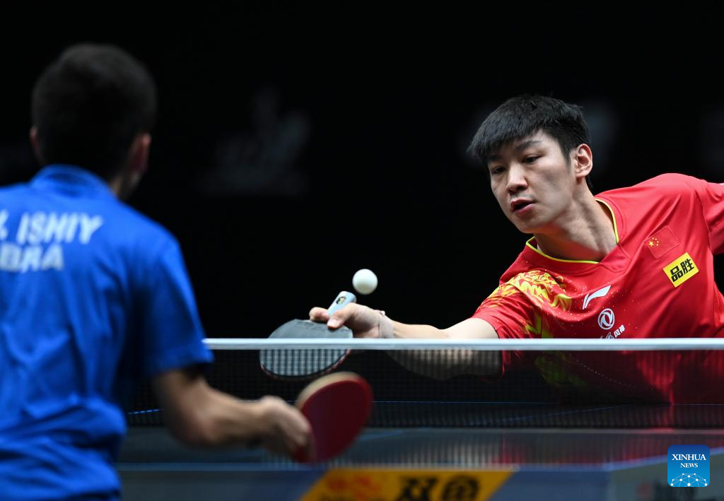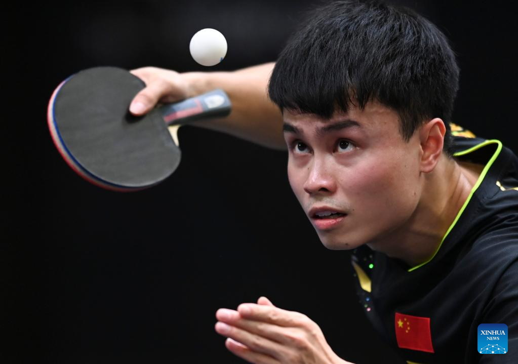 Xue Fei of China hits a return during the men's singles round of 64 match between Xue Fei of China and Vitor Ishiy of Brazil at the WTT Star Contender Doha 2022 in Doha, Qatar, March 27, 2022. (Photo by Nikku/Xinhua)
