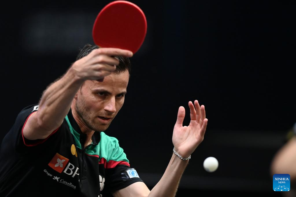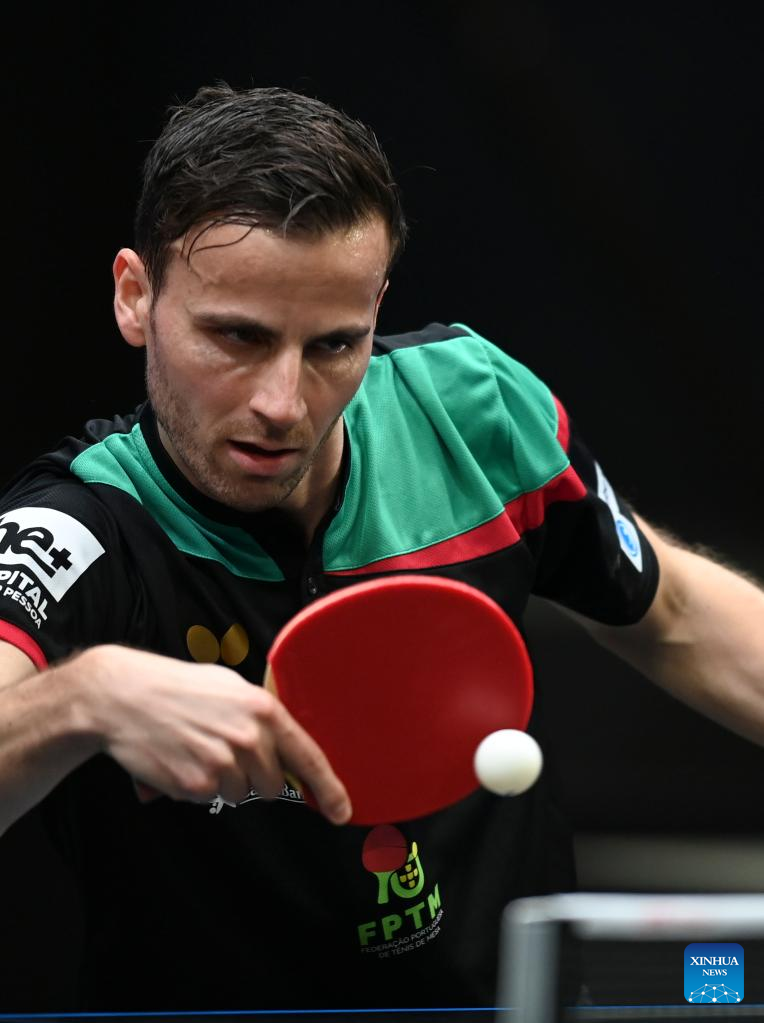 Tiago Apolonia of Portugal hits a return during the men's singles round of 64 match between Zhou Qihao of China and Tiago Apolonia of Portugal at the WTT Star Contender Doha 2022 in Doha, Qatar, March 27, 2022. (Photo by Nikku/Xinhua)