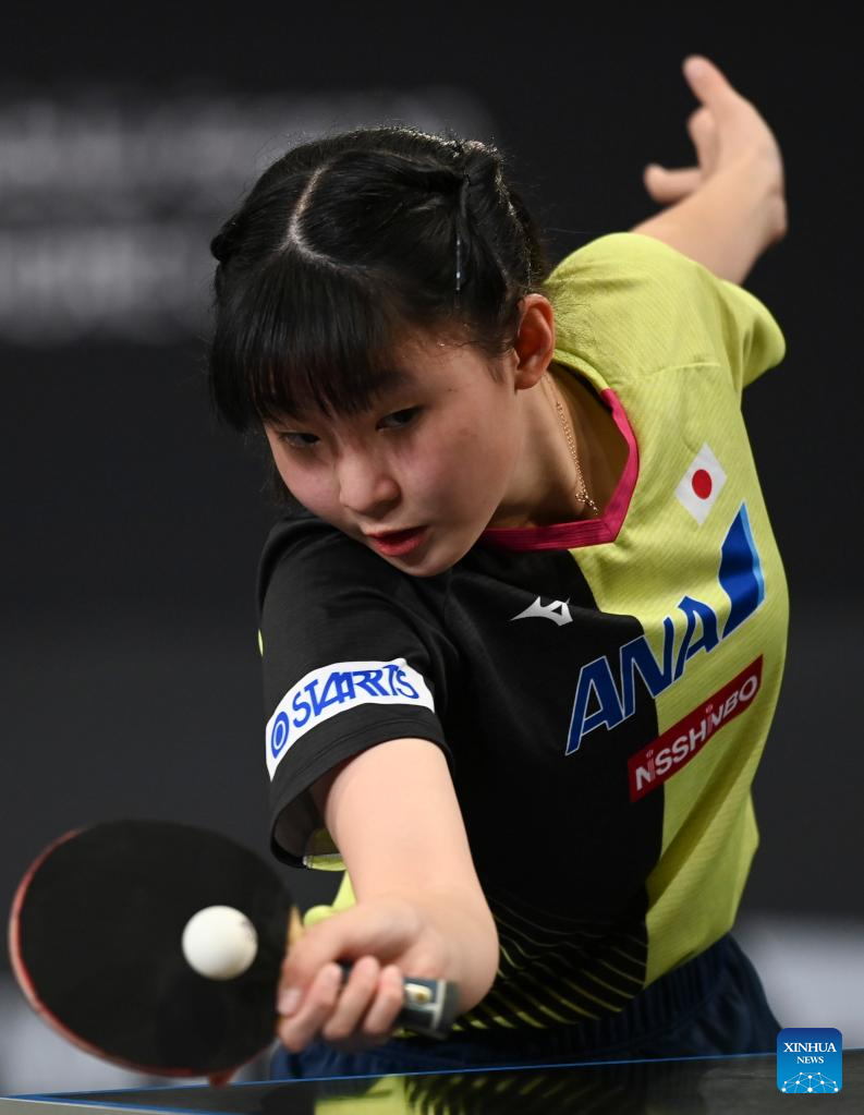 Harimoto Miwa of Japan hits a return during the women's singles round of 64 match between Harimoto Miwa of Japan and Dina Meshref of Egypt at the WTT Star Contender Doha 2022 in Doha, Qatar, March 27, 2022. (Photo by Nikku/Xinhua)