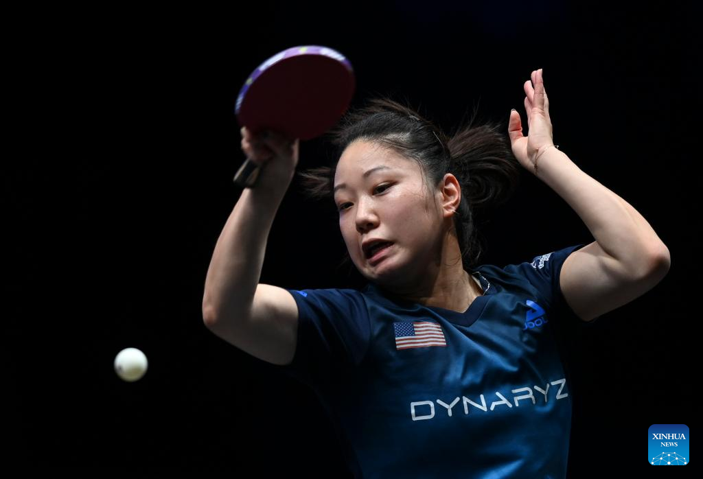 Lily Zhang of the United States hits a return during the women's singles round of 48 match between Lily Zhang of the United States and Tetyana Bilenko of Ukraine at the WTT Star Contender Doha 2022 in Doha, Qatar, March 27, 2022. (Photo by Nikku/Xinhua)