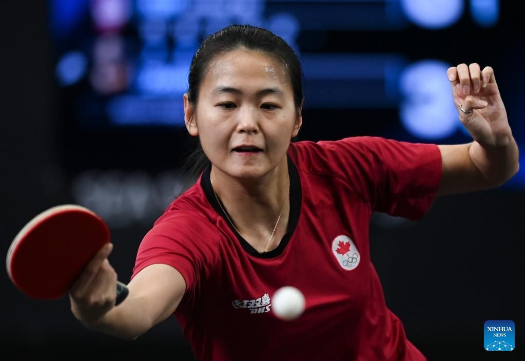 Zhang Mo of Canada hits a return during the women's singles round of 64 match between Zhang Mo of Canada and Kim Hayeong of South Korea at the WTT Star Contender Doha 2022 in Doha, Qatar, March 27, 2022. (Photo by Nikku/Xinhua)