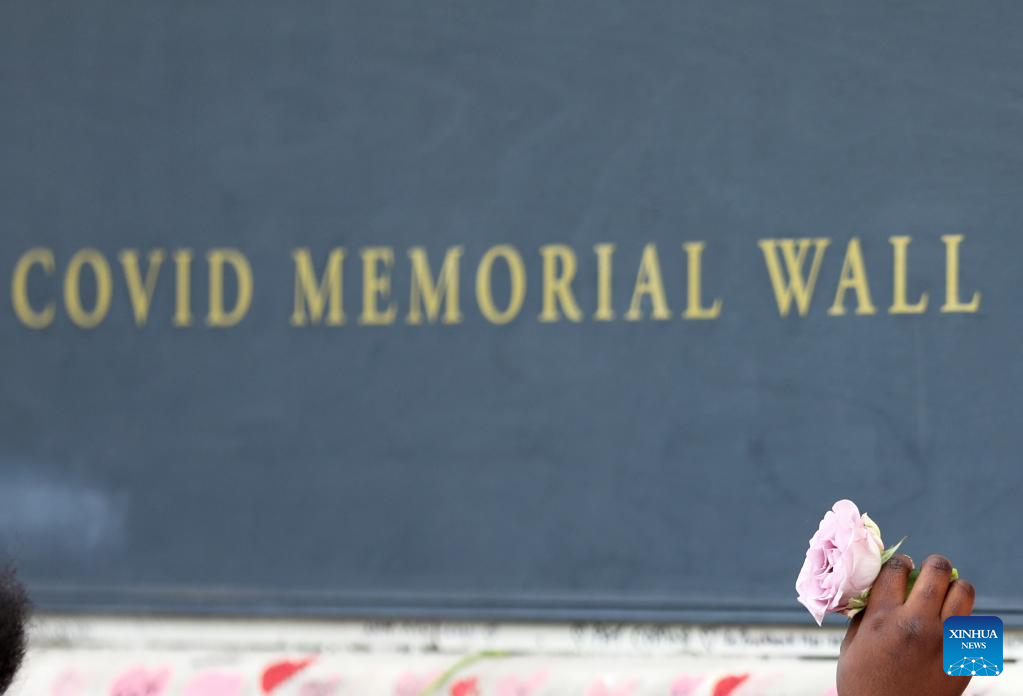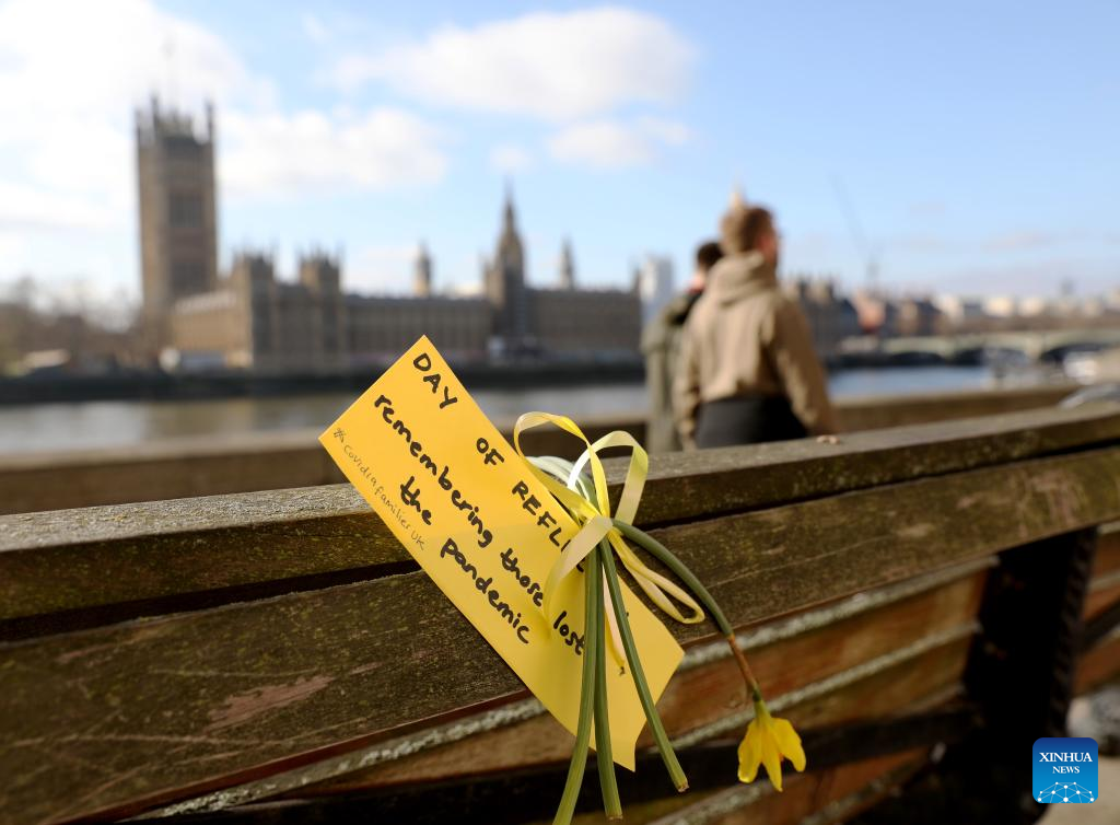 A bunch of flowers are laid as a tribute to victims of the COVID-19 pandemic at the National COVID Memorial Wall in London, Britain, March 27, 2022. (Xinhua/Li Ying)
