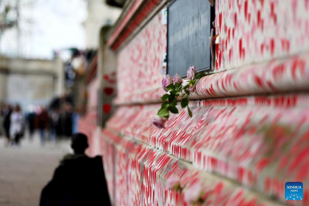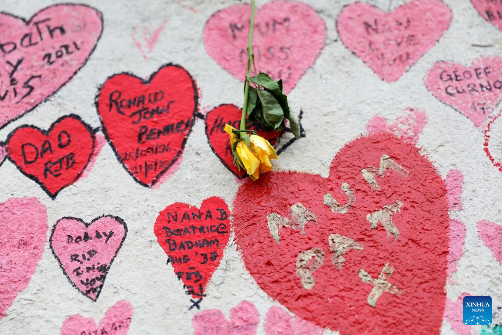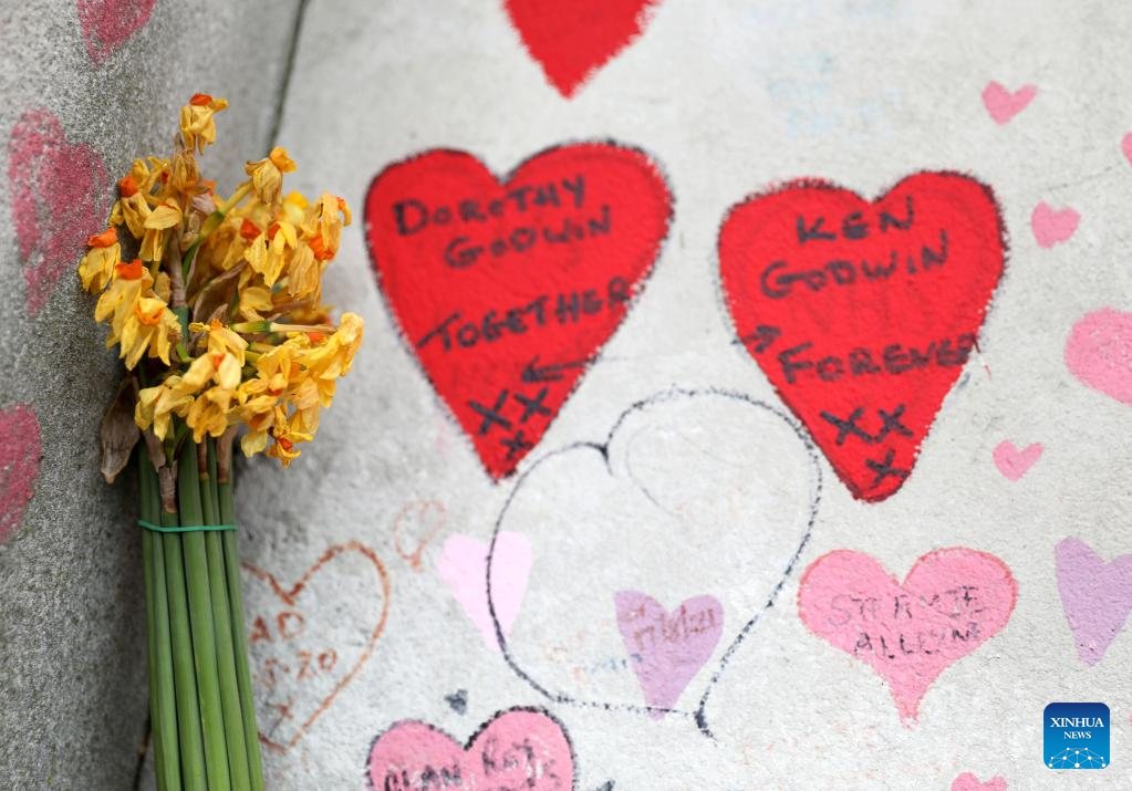 Flowers, hand painted hearts and messages commemorating victims of the COVID-19 pandemic are seen on the National COVID Memorial Wall in London, Britain, March 27, 2022. (Xinhua/Li Ying)