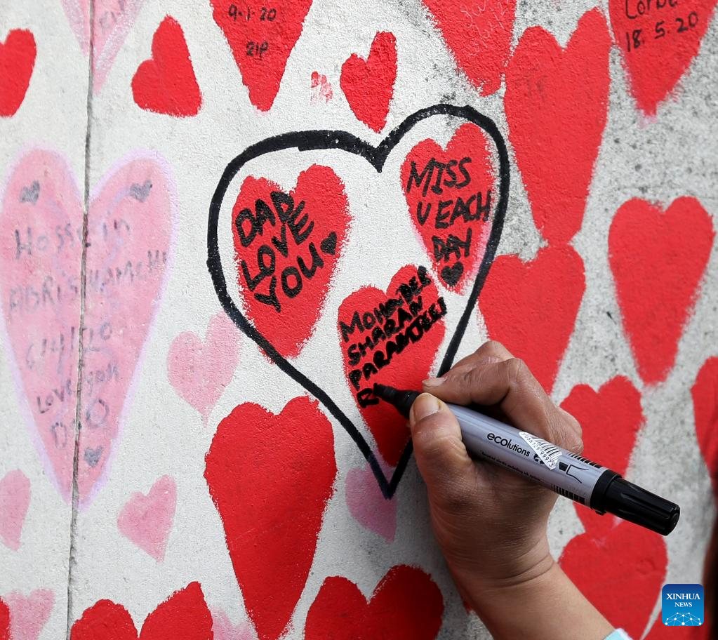 Hand painted hearts and messages commemorating victims of the COVID-19 pandemic are seen on the National COVID Memorial Wall in London, Britain, March 27, 2022. (Xinhua/Li Ying)