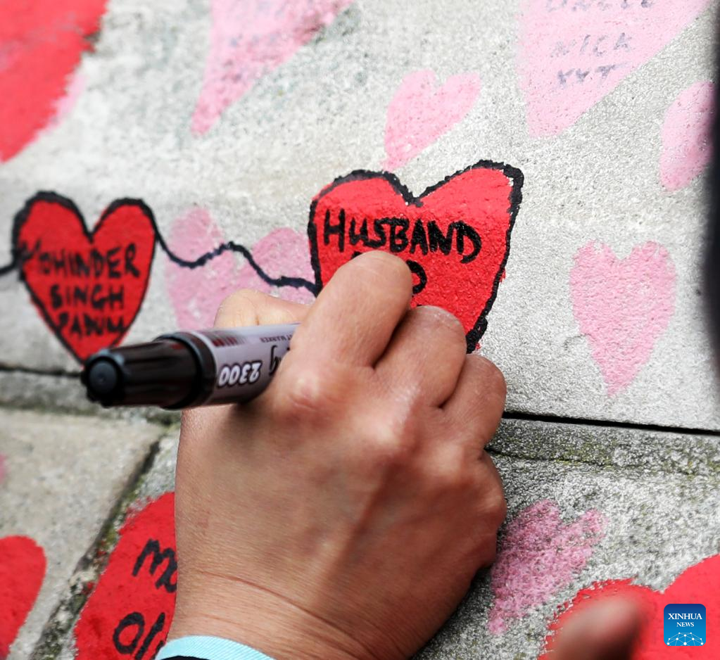 A woman writes a message on a hand painted heart to commemorate victims of the COVID-19 pandemic at the National COVID Memorial Wall in London, Britain, March 27, 2022. (Xinhua/Li Ying)