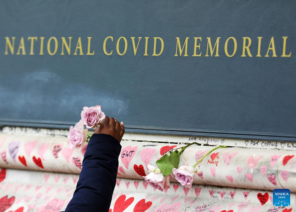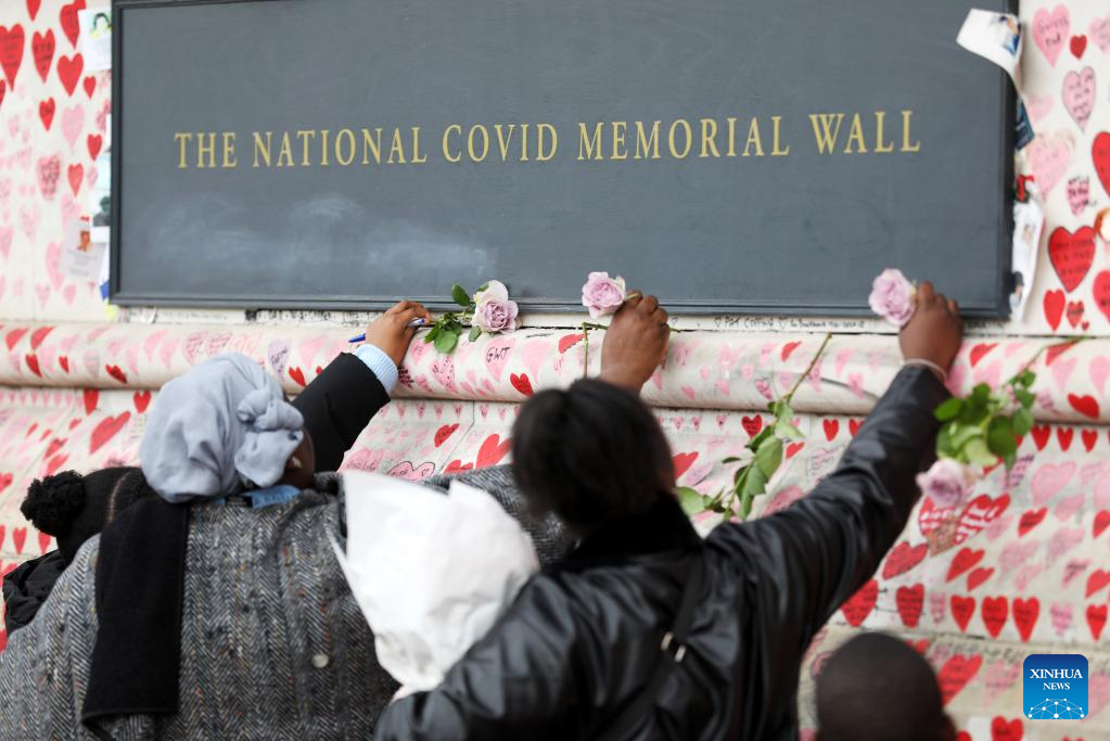 People put flowers on the National COVID Memorial Wall in London, Britain, March 27, 2022. (Xinhua/Li Ying)