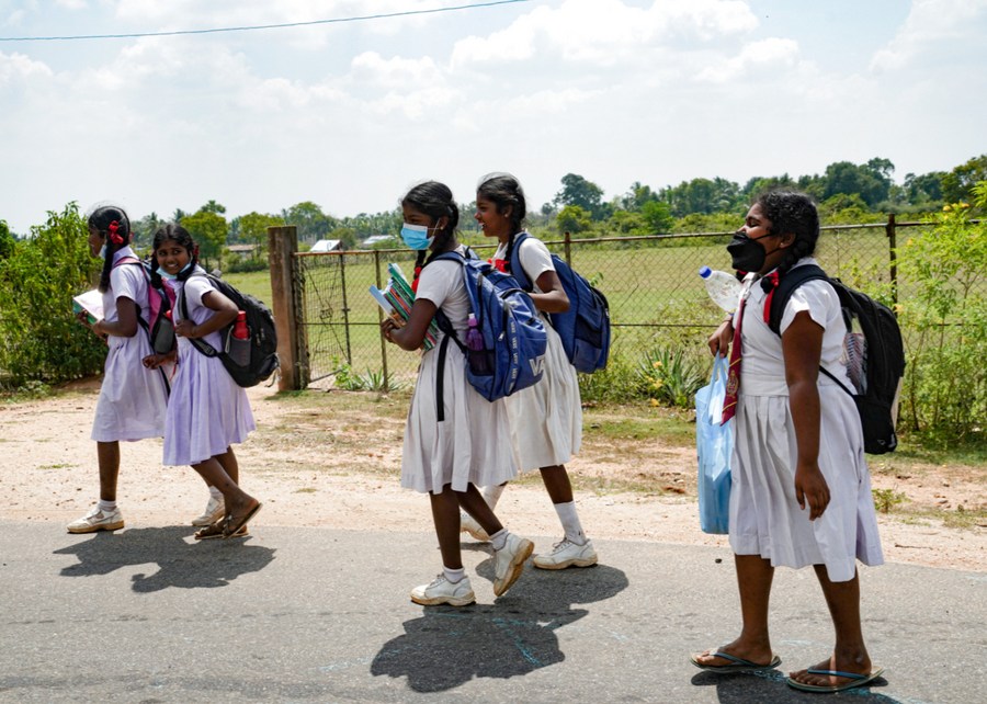 Students walk on upgraded road in Vavuniya in Sri Lanka's Northern Province on March 11, 2022. (Xinhua/Tang Lu)