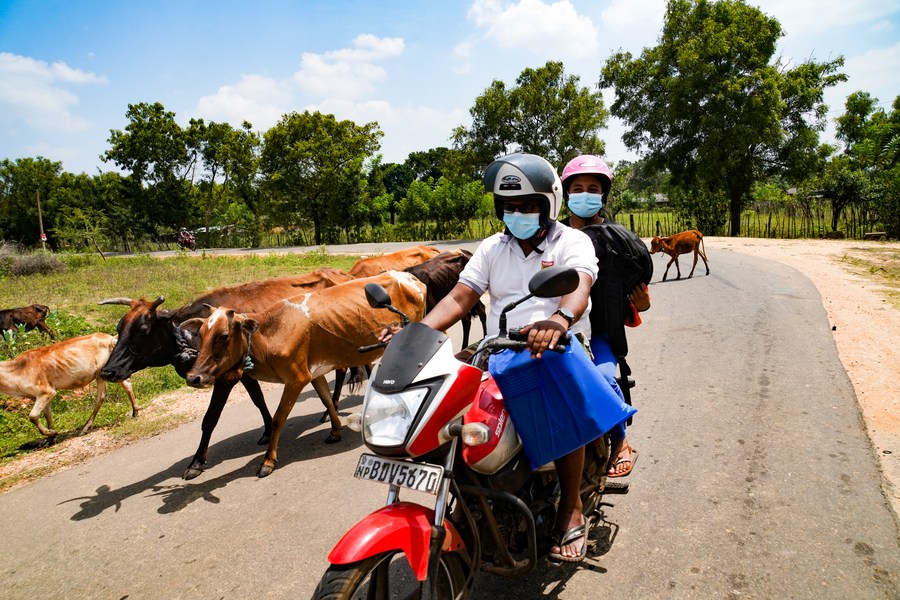 Photo taken on March 11, 2022 shows people riding a motorcycle on upgraded road in Vavuniya in Sri Lanka's Northern Province. (Xinhua/Tang Lu)