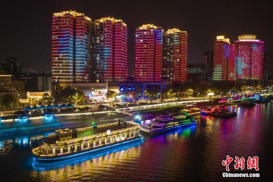 Aerial photo shows the view of illuminated downtown Xiangyang, central China's Hubei Province, March 27, 2022. Xiangyang is an ancient city with a history of more than 2,800 years and was first built in the Han Dynasty (206BC-220AD). (Photo: China News Service/Yang Dong)
