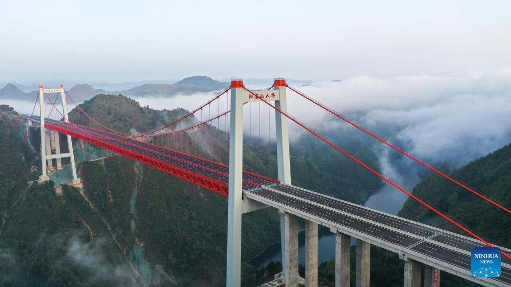 Aerial photo taken on March 28, 2022 shows the Yangbaoshan grand bridge along Guiyang-Huangping Highway in southwest China's Guizhou Province. The construction of the main line of Guiyang-Huangping Highway has entered the final stage and is expected to be completed within this year. The main line of this highway stretches 120.6 kilometers and will connect Guizhou with the Yangtze River Delta region. (Xinhua/Yang Wenbin)