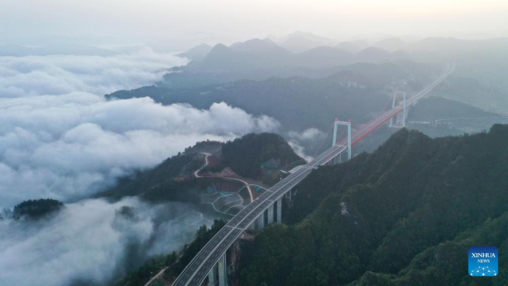 Aerial photo taken on March 28, 2022 shows the Xinminjing grand bridge along Guiyang-Huangping Highway in southwest China's Guizhou Province. The construction of the main line of Guiyang-Huangping Highway has entered the final stage and is expected to be completed within this year. The main line of this highway stretches 120.6 kilometers and will connect Guizhou with the Yangtze River Delta region. (Xinhua/Yang Wenbin)