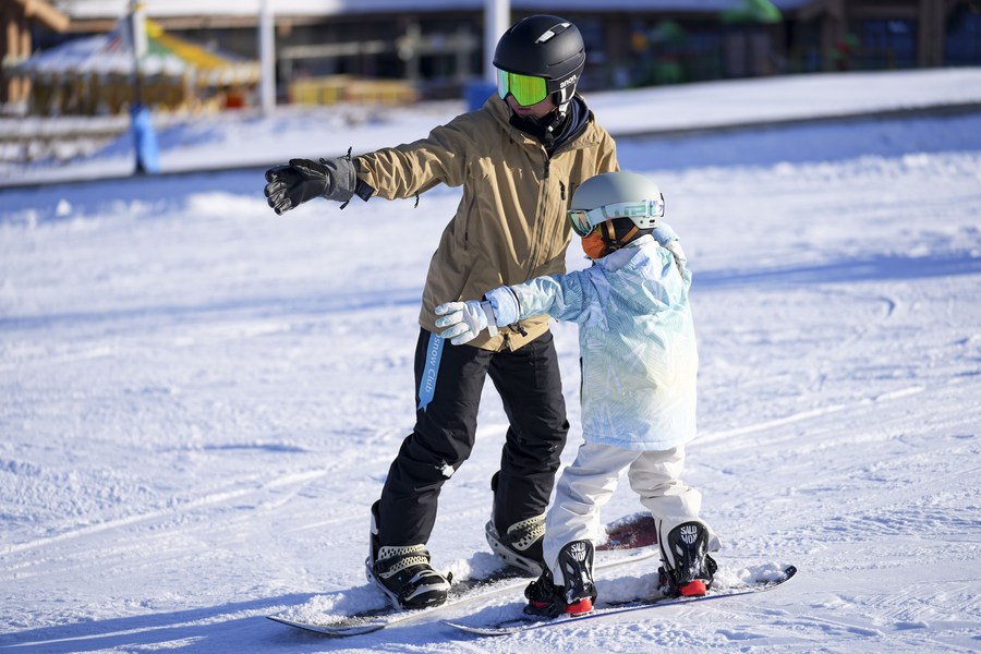 A child skies with the help of a parent at White Mountain Resort in Fusong, Northeast China's Jilin province, Nov 19, 2021. [Photo/Xinhua]