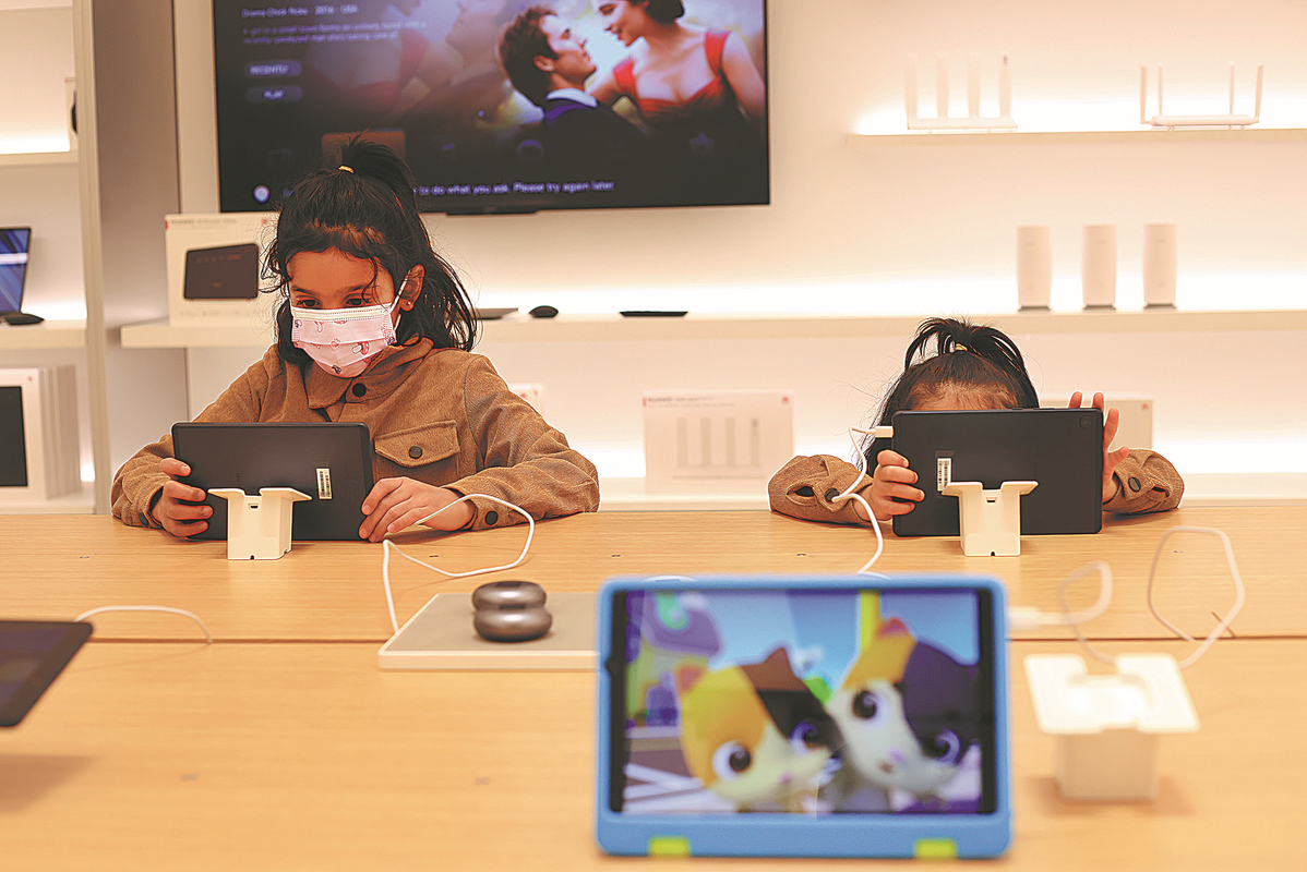 Two children try out Huawei's touchscreen smart PCs at a Huawei store in Riyadh, Saudi Arabia. [Photo/Xinhua]