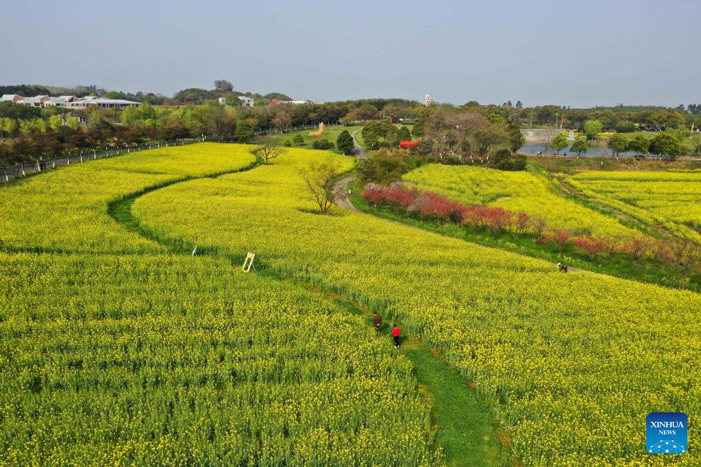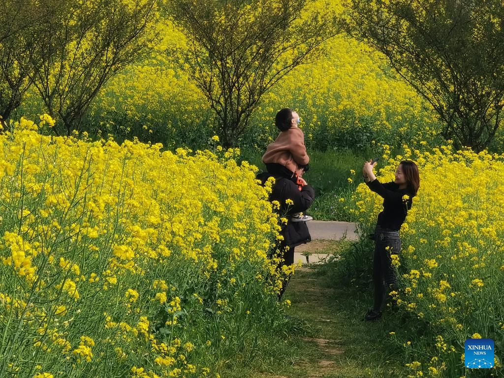 People enjoy themselves in a cole flower field in Gaochun District of Nanjing, east China's Jiangsu Province, March 28, 2022. (Xinhua/Zhu Xudong)