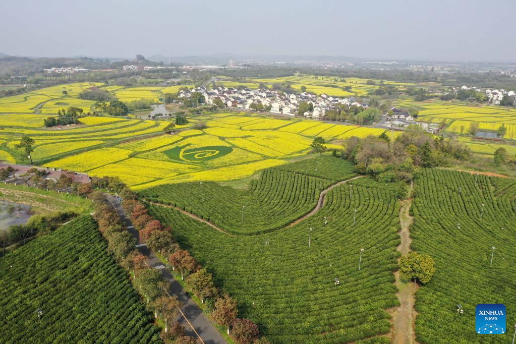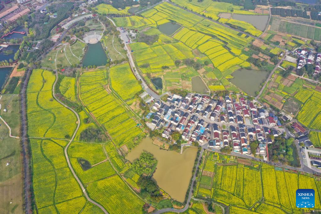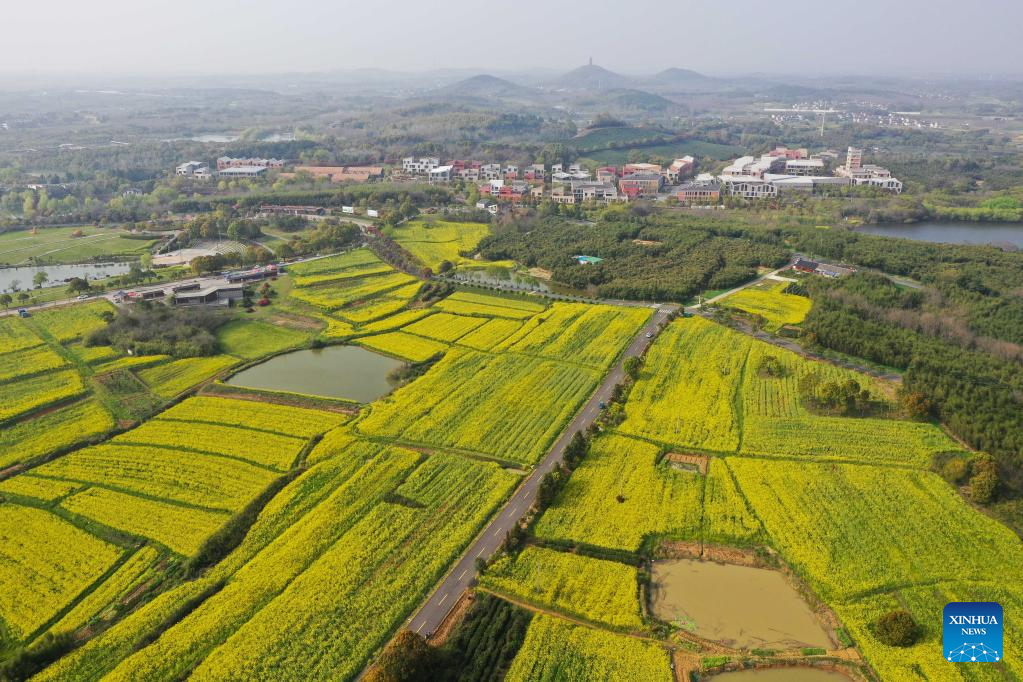 Aerial photo taken on March 28, 2022 shows the scenery of a cole flower field in Gaochun District of Nanjing, east China's Jiangsu Province. (Xinhua/Ji Chunpeng)