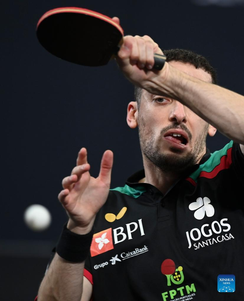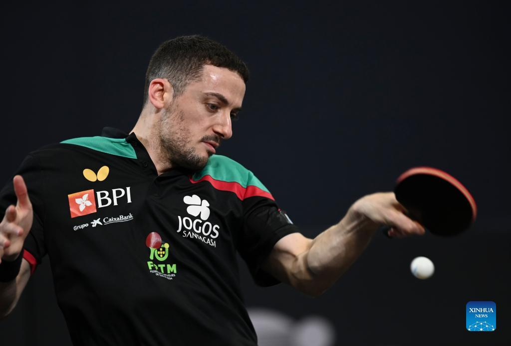 Marcos Freitas of Portugal hits a return during the men's singles round of 32 match between Zhou Qihao of China and Marcos Freitas of Portugal at the WTT Star Contender Doha 2022 in Doha, Qatar, March 28, 2022. (Photo by Nikku/Xinhua)